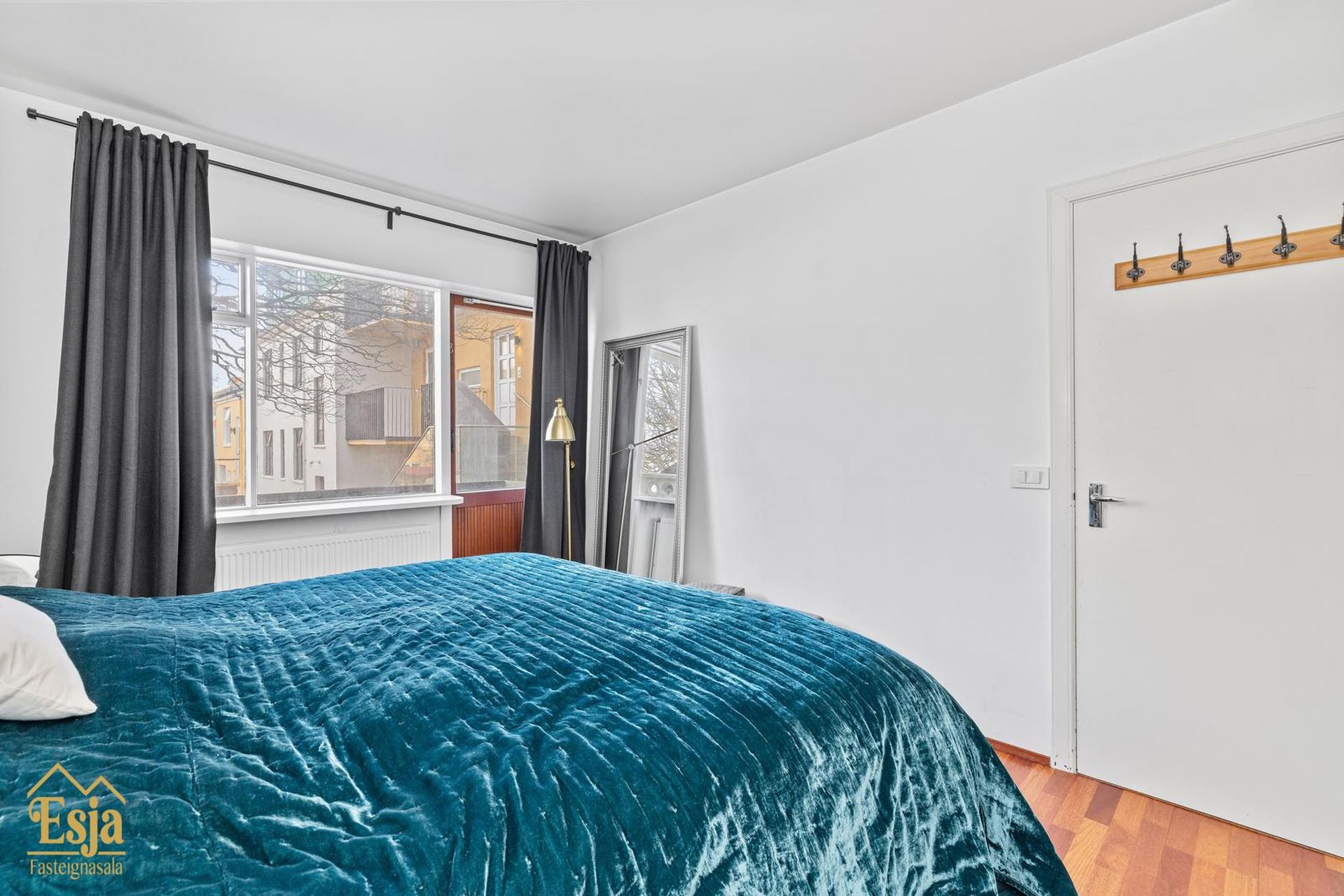 Svefnherbergi eru 2, aðalsvefnherbergið er rúmgott með upprunalegum skápum sem ná alveg upp í loft og eru góðar geymslur. Gengið er út á svalir sem snúa inn í inngarð mót vestri er frá hjónaherberginu.