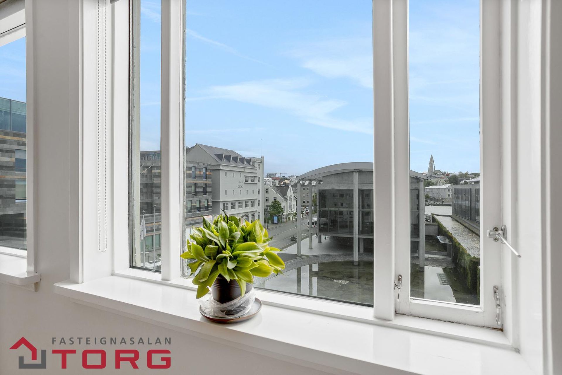 Umrædd eign er staðsett á 4. hæð með einstöku útsýni í átt að ráðhúsi Reykjavíkur og Hallgrímskirkju.