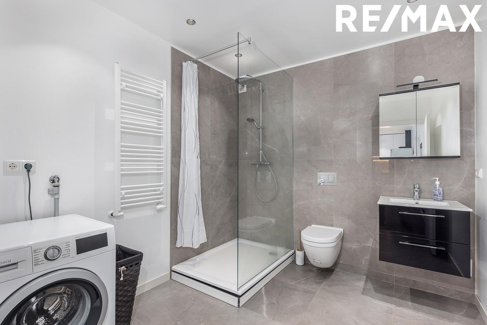 Baðherbergið er rúmgott, flísalögð gólf og hluti veggja, opin sturta, handklæðaofn, upphent wc, tengi fyrir þvottavél og þurrkara.
