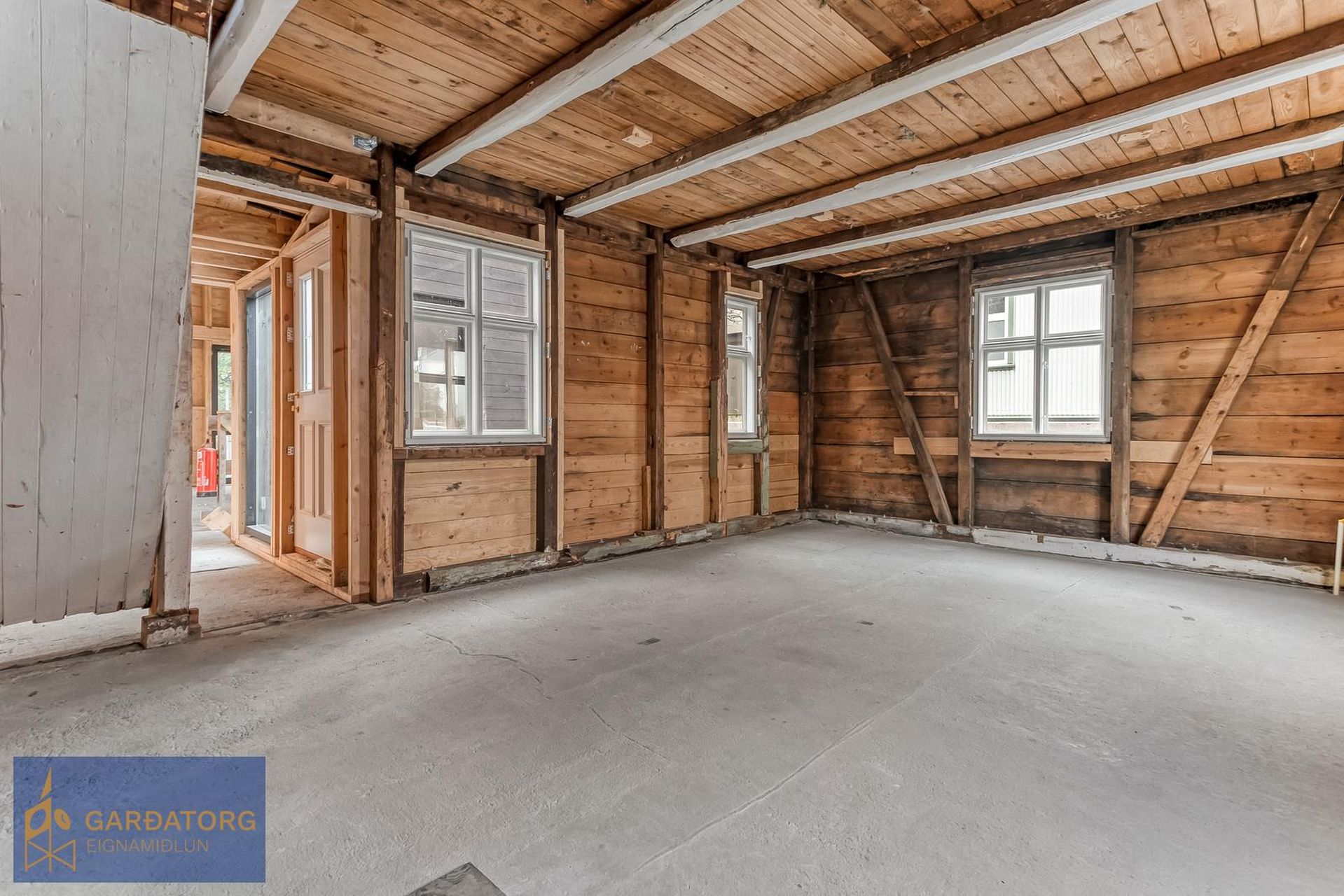 Um er að ræða 159.9 fm einbýlishús sem samanstendur af gömlu mikið endurnýjuðu járnklæddu timburhúsi á tveimur hæðum sem fært var á nýja uppsteyptan kjallara með mikilli lofthæð og nýrri viðbyggingu. Húsið er allt ný klætt með nýjum gluggum og hurðum. Húsið er fokhelt að innan en fullbuið að útan ásamt garði og afhent í núverandi ástandi með fokheldisvottorði. Járn á eldri byggingu þarf að mála í lit ákveðin í sameiningu af húsafriðunarnefnd. Búið er að taka inn vatn og hitaveitu ásamt tengirörum fyrir fjarskipti en lagnir að öðru leyti ófrágengnar. Húsið gefur mikla möguleika að innrétta það til útleigu..