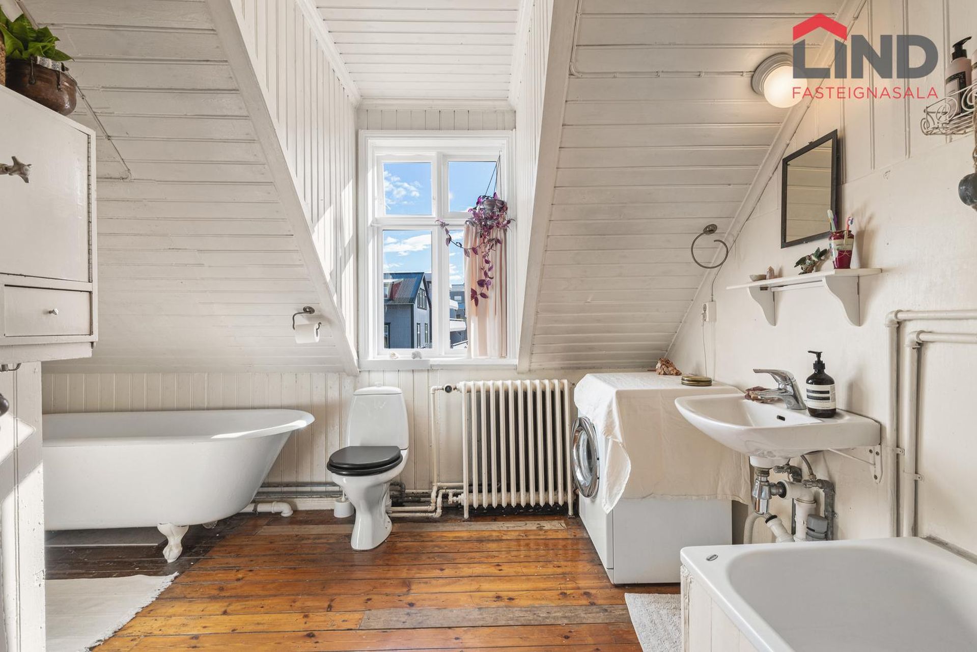 Lind fasteignasala / Heimir Hallgrímsson lögg. fasteignasali kynna til sölu glæsilega og sjarmerandi 3ja herbergja útsýnisíbúð með svölum á 3. hæð í afar fallegu bárujárnsklæddu timburhúsi byggðu árið 1907. Íbúðin er skráð 74,1 fermetrar að stærð en er mun stærri (um 90 fm utan háalofts) að grunnfleti þar sem hluti íbúðar er undir súð og nýtast þeir fermetrar mjög vel. Íbúðin er með upphaflegum viðarborðum á gólfum og panelklæddum veggjum og loftum. Aukin lofthæð er yfir hluta af stofum með fallegum viðarbitum í lofti. Reynt hefur verið að halda í upprunlegt horf hússins í viðhaldssögu þess. M.a. voru allir gluggar á austur- og suðurhlið endurnýjaðir (sérsmíðaðir) á árinu í upprunalegum stíl hússins. Þá var eldhús endurnýjað nýlega á smekklegan máta. Auk þess er búið að endurnýja mest af neysluvatnslögnum og rafmagnstöflu innan íbúðar.