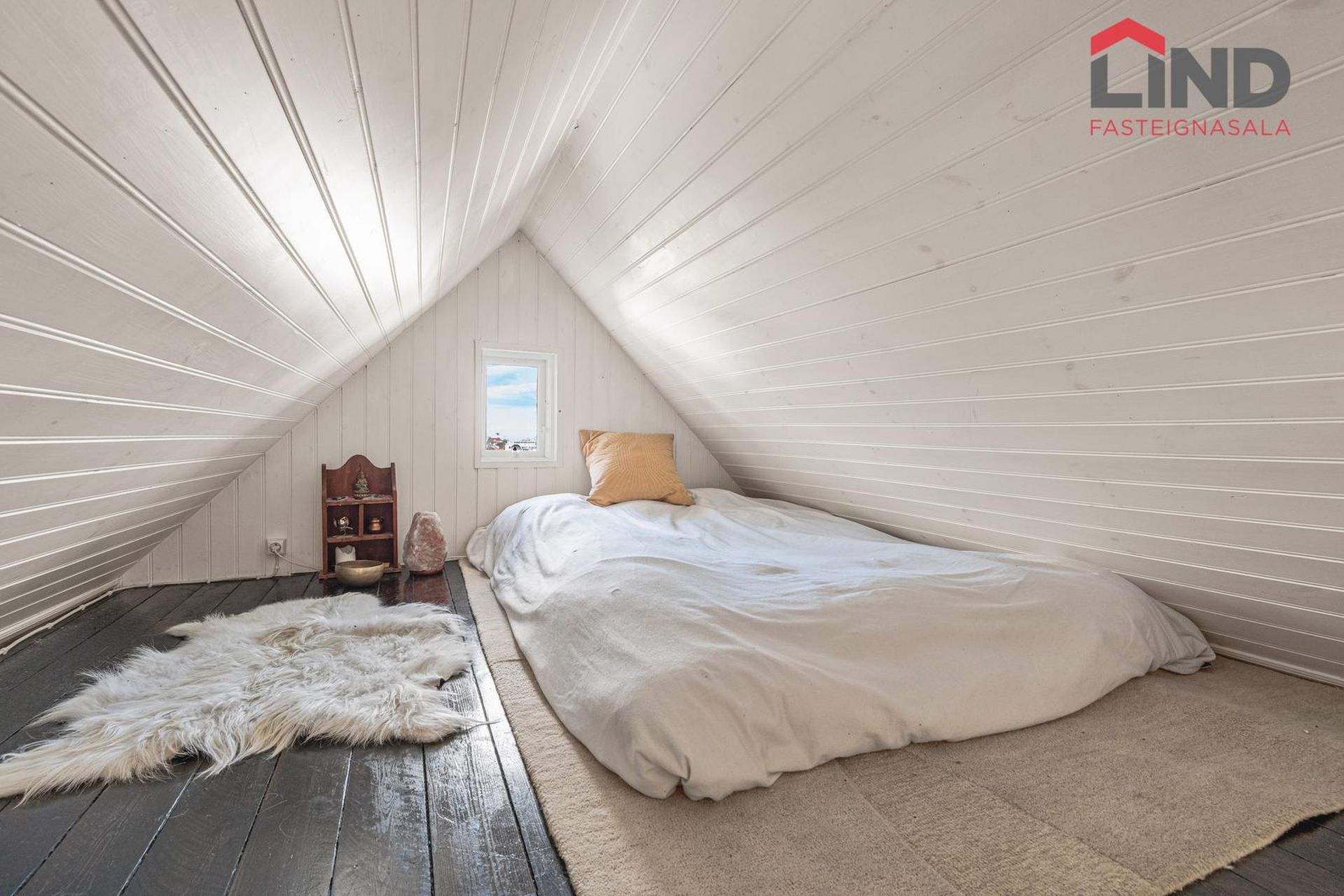 Stofa: Er stór með viðarfjölum á gólfum og panelklæddum veggjum/loftum. Aukin lofthæð og sjarmerandi gluggar til austurs og suðurs.