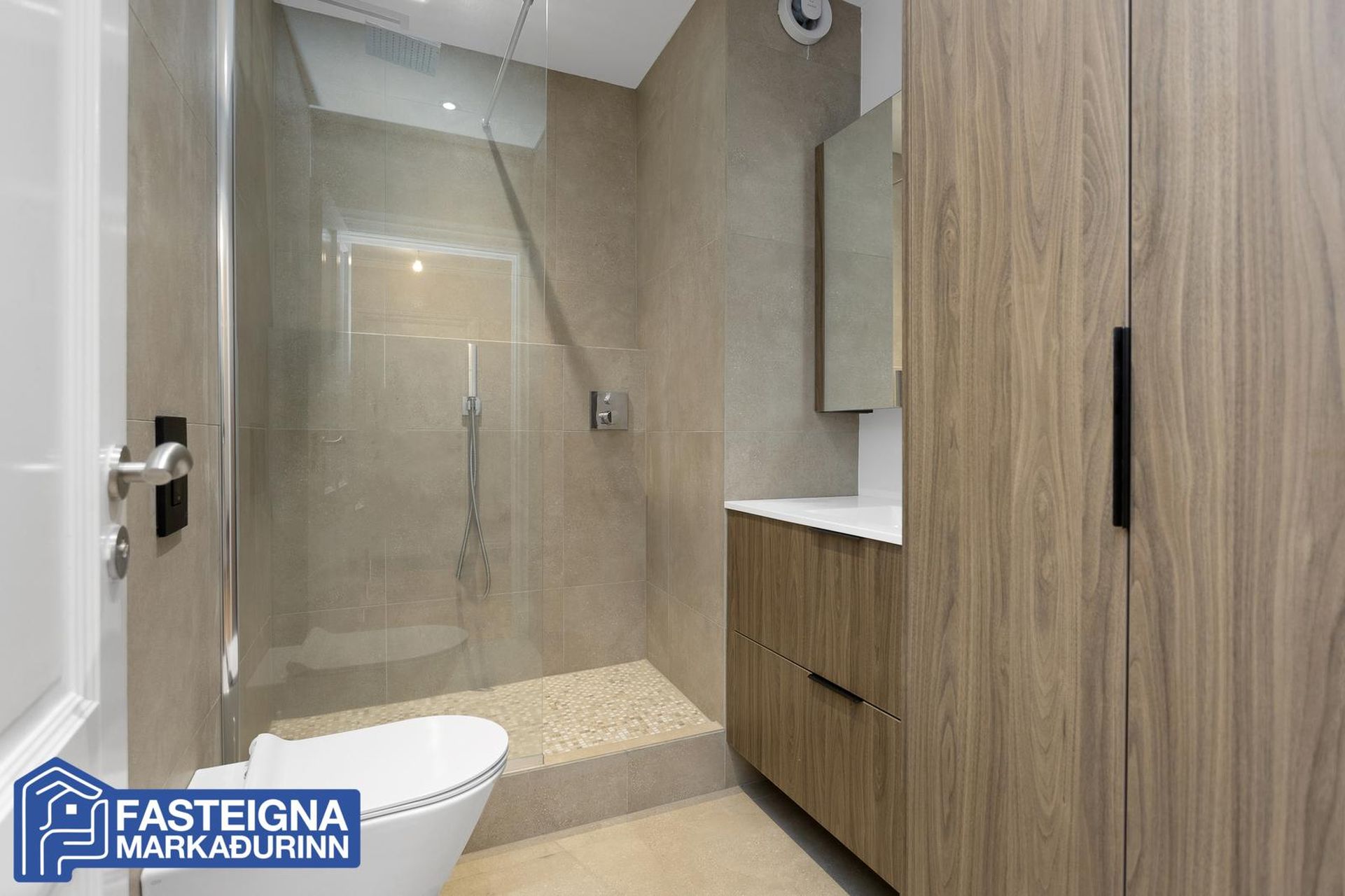 Baðherbergi, inn af holi er nýendurnýjað á vandaðan máta. Flísalagt gólf og veggir, gólfhiti, flísalögð stór sturta með sturtugleri og innbyggðum vönduðum tækjum í vegg. Tölvustýrt wc með hita í setu.