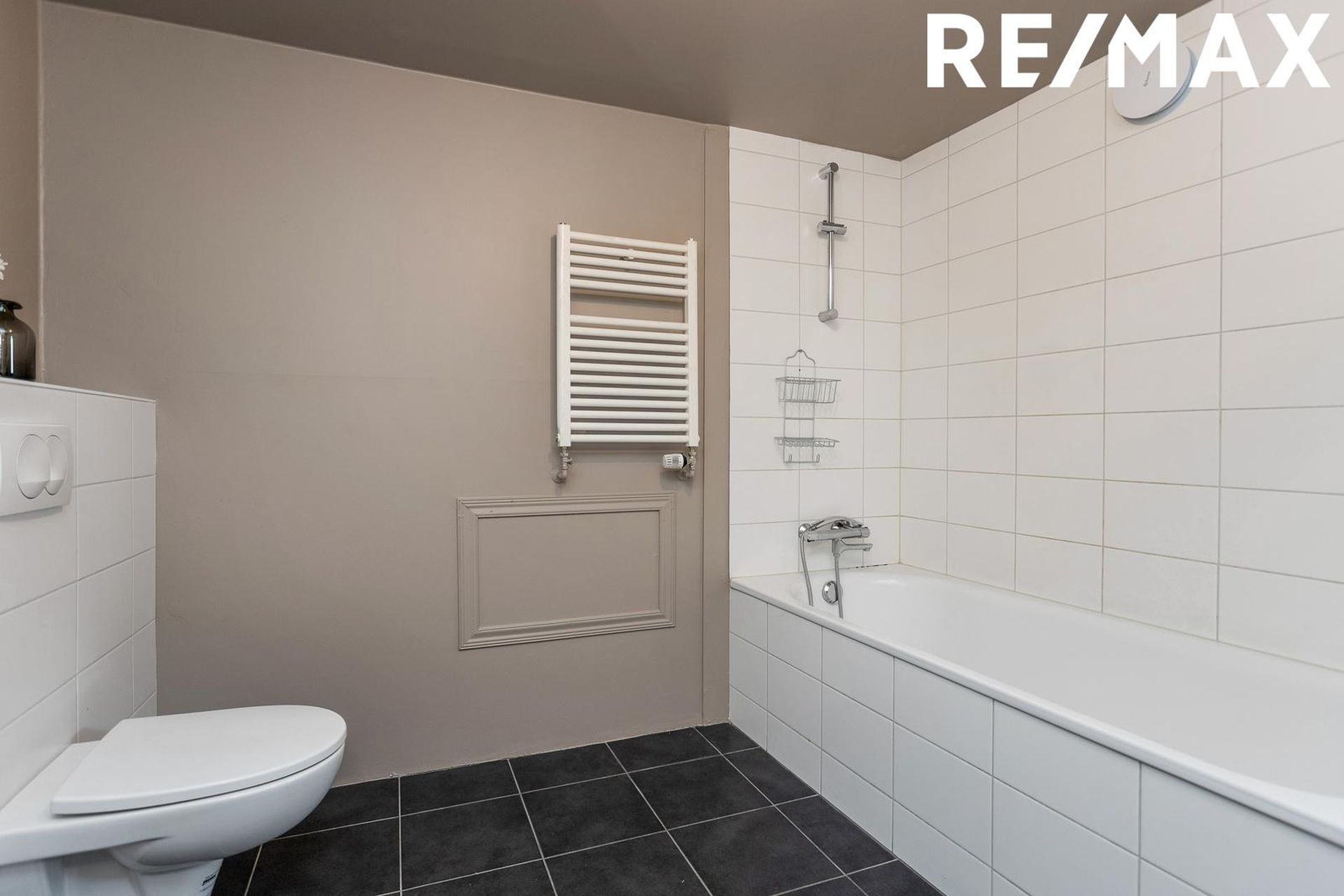 Baðherbergi: Flísalagt baðherbergi með baðkari, innréttingu með handlaug, upphengdu salerni og tengi fyrir þvottavél.