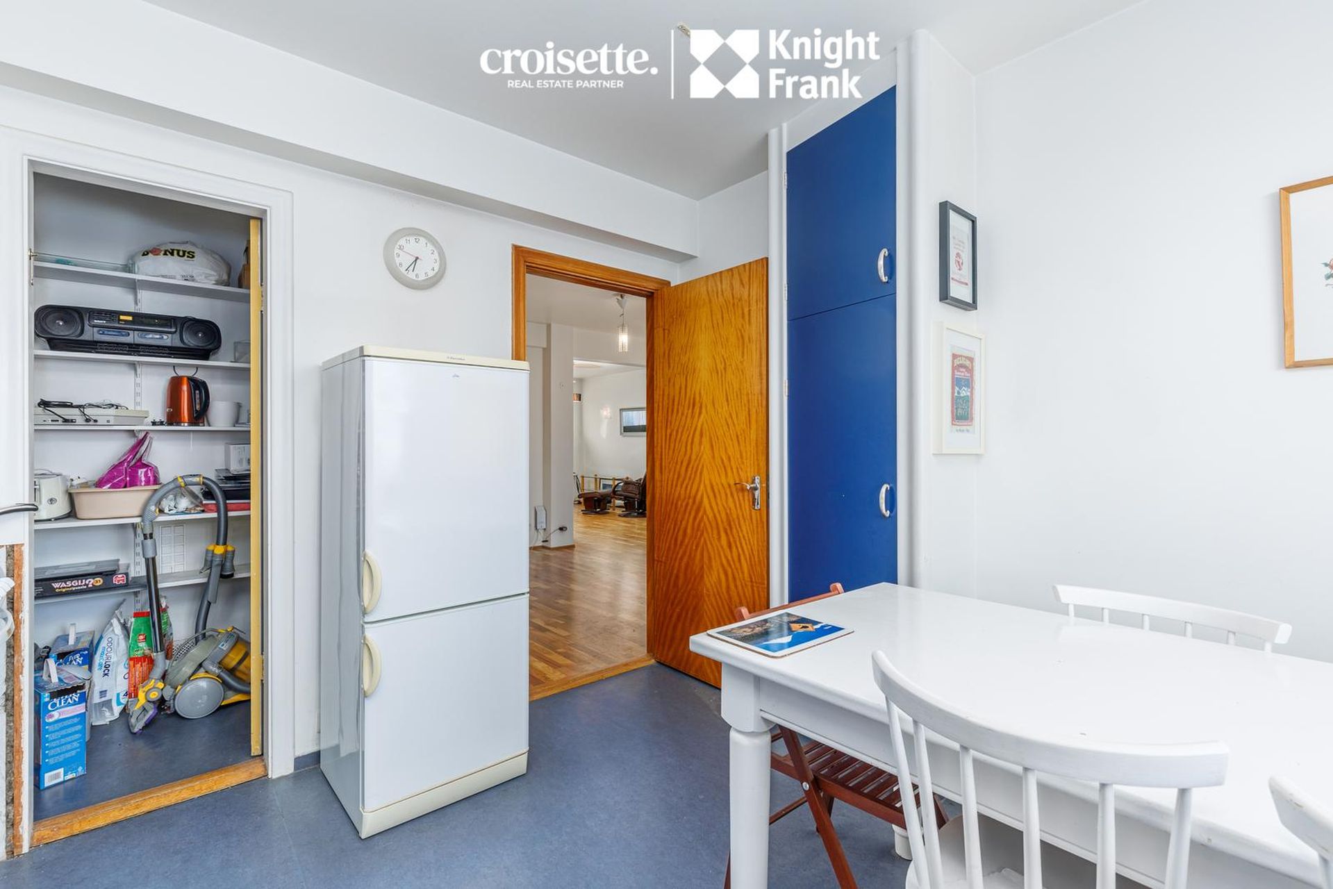 Eldhús: Flott upprunaleg innrétting, gott skápapláss. Dúkur á gólfi. Búr/geymsla