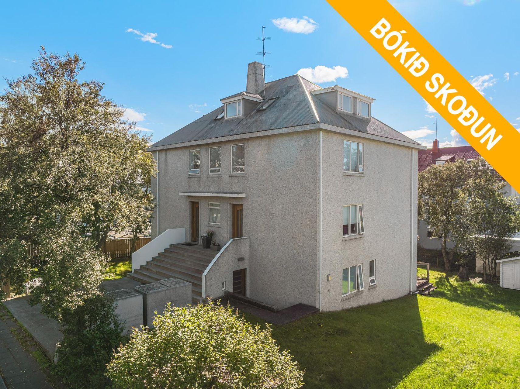 Aðkoman að húsinu er falleg, en húsið var endursteinað 2011, tröppur múraðar 2024 og nýtt grindverk byggt umhverfis garðinn.