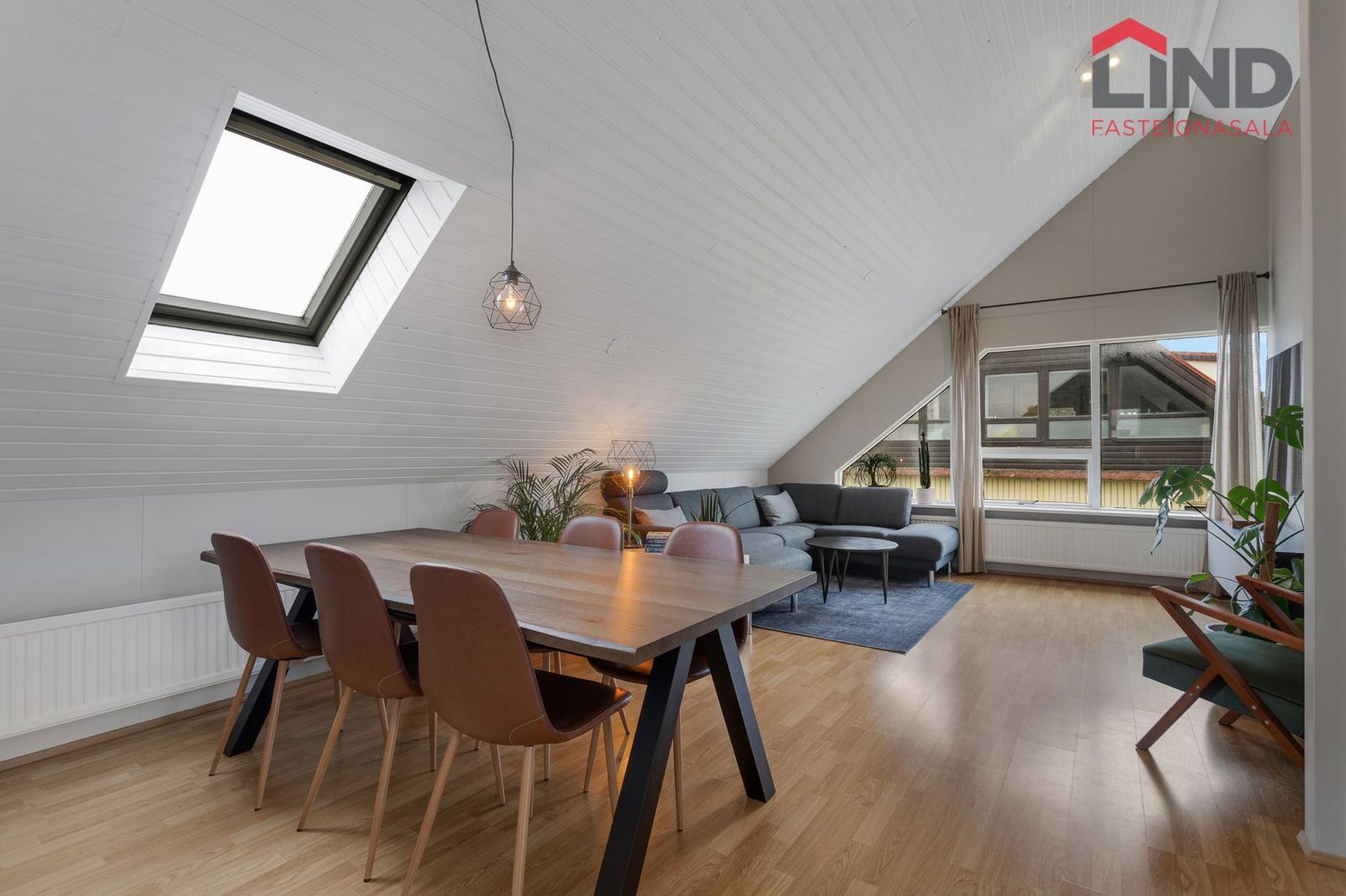 · Stofa/borðstofa bjart og opið rými, parketlagt, hátt til lofts með glugga til suðurs og þakglugga við borðstofu.
