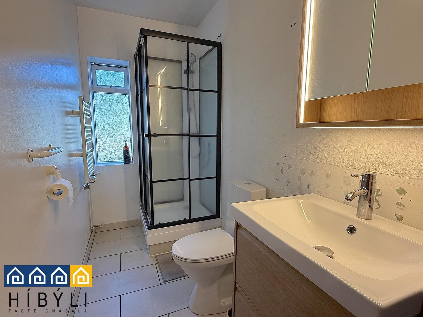 Baðherbergi: flísar á gólfi, hornsturtuklefi, handklæðaofn, gluggi.