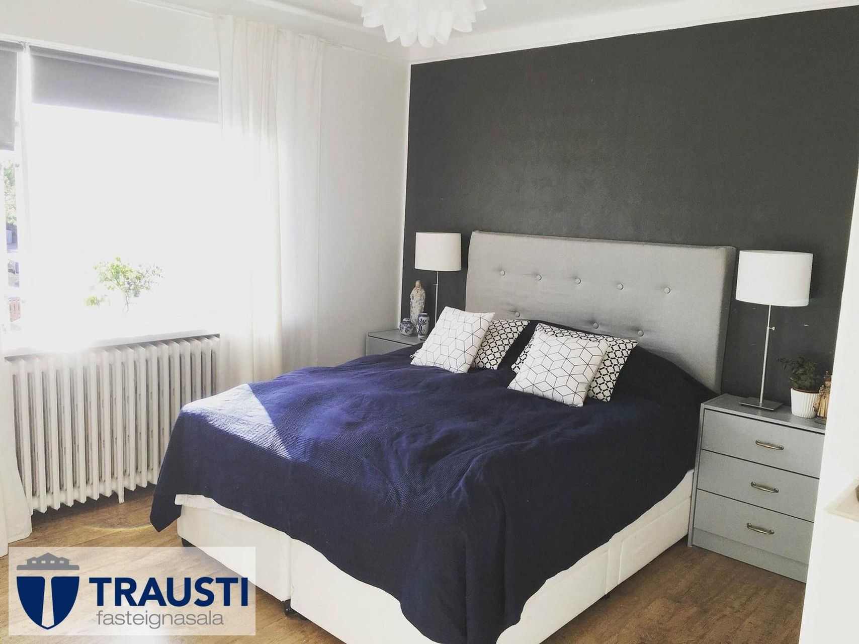 Hjónaherbergi rúmgott með góðu skápaplássi og parket á gólfi.