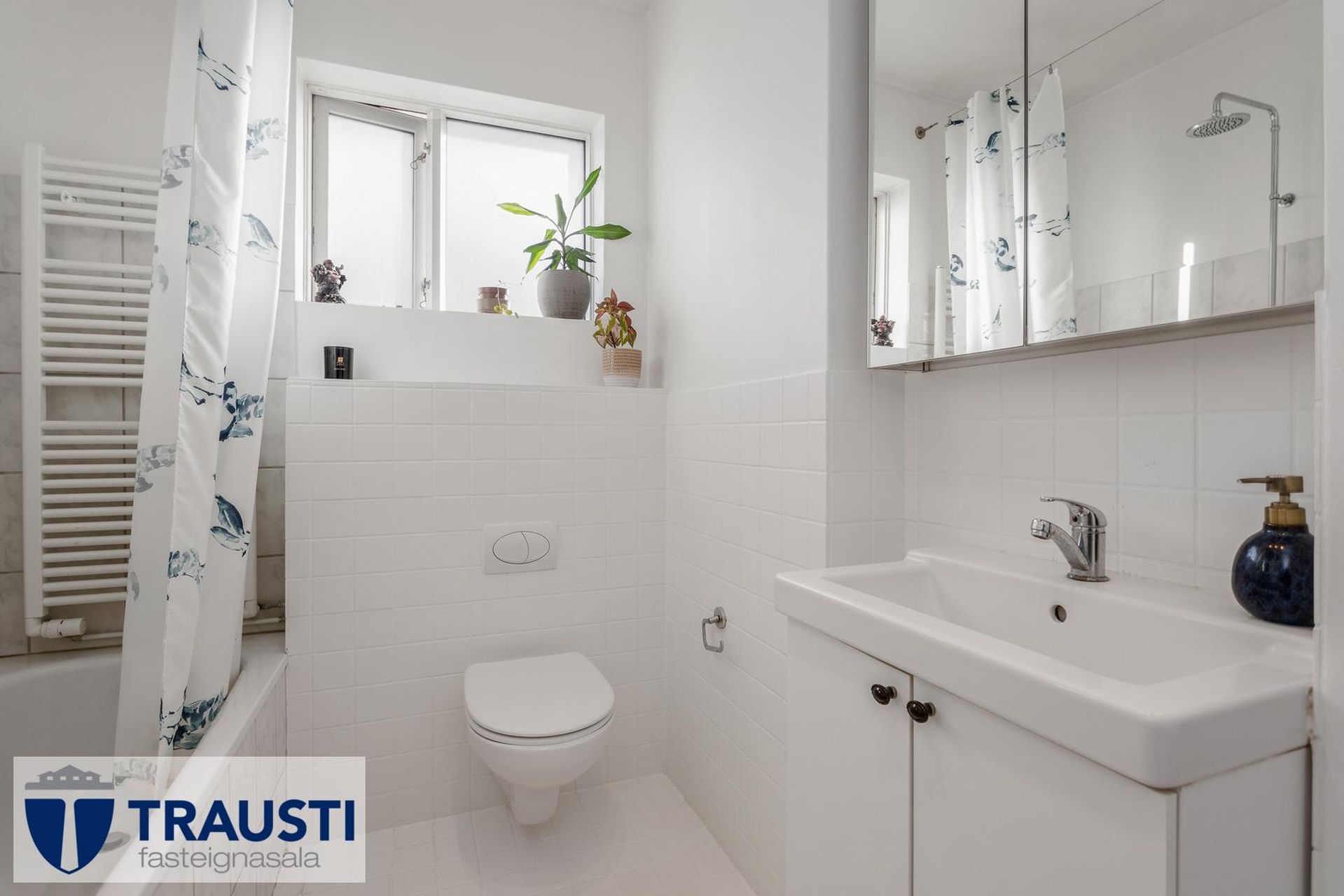 Baðherbergi með baðkari með sturtuaðstöðu, hvítri vaskinnréttingu, upphengdu salerni og glugga. Flísar á veggjum og gólfi.