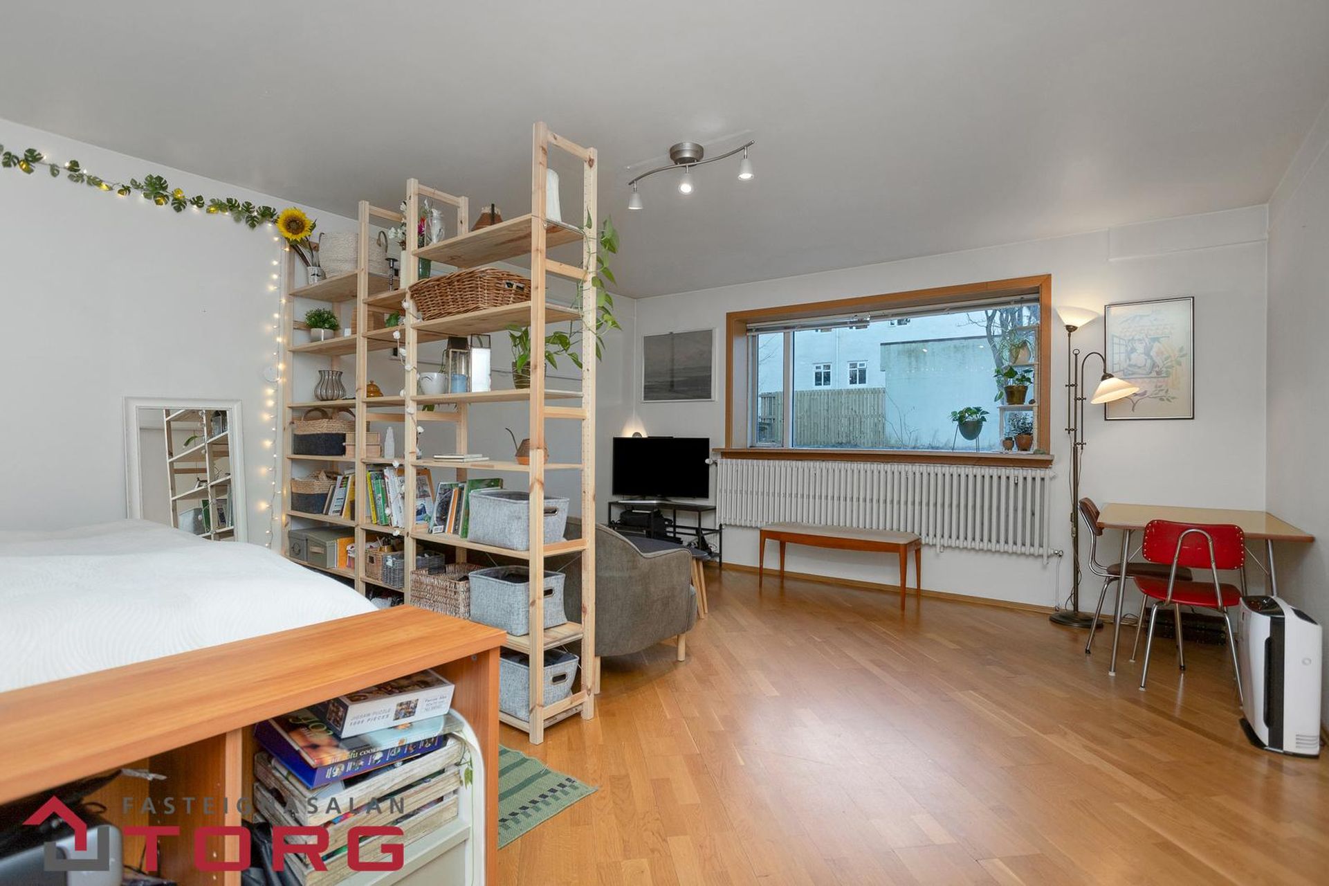 Stofa: Mjög rúmgóð (nú nýtt sem stofa og herbergi). Stór gluggi.