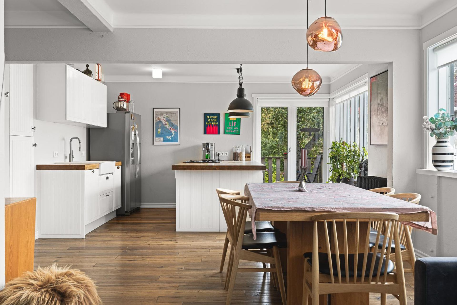 Eldhúsið er stórt og opið með hvítlakkaðri innréttingu og mjög stórri eyju með stóru gashelluborði. Þykkar límtrésborðplötur og parket á gólfi.