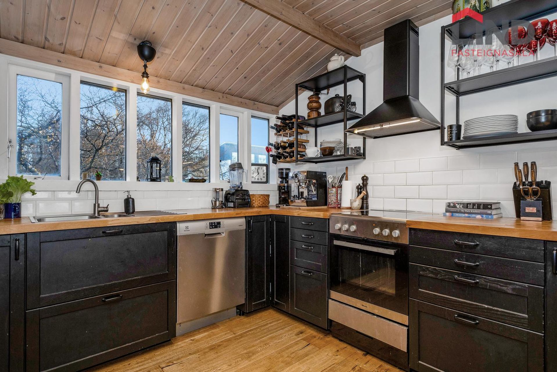 Eldhúsið er rúmgott og opið við stofuna með viðarparket á gólfi og góð innrétting með miklu skápaplássi og vinnurými. Opnar hillur, flísar við borð og eyja sem hægt er að sitja við. Gluggar til norð- austurs.