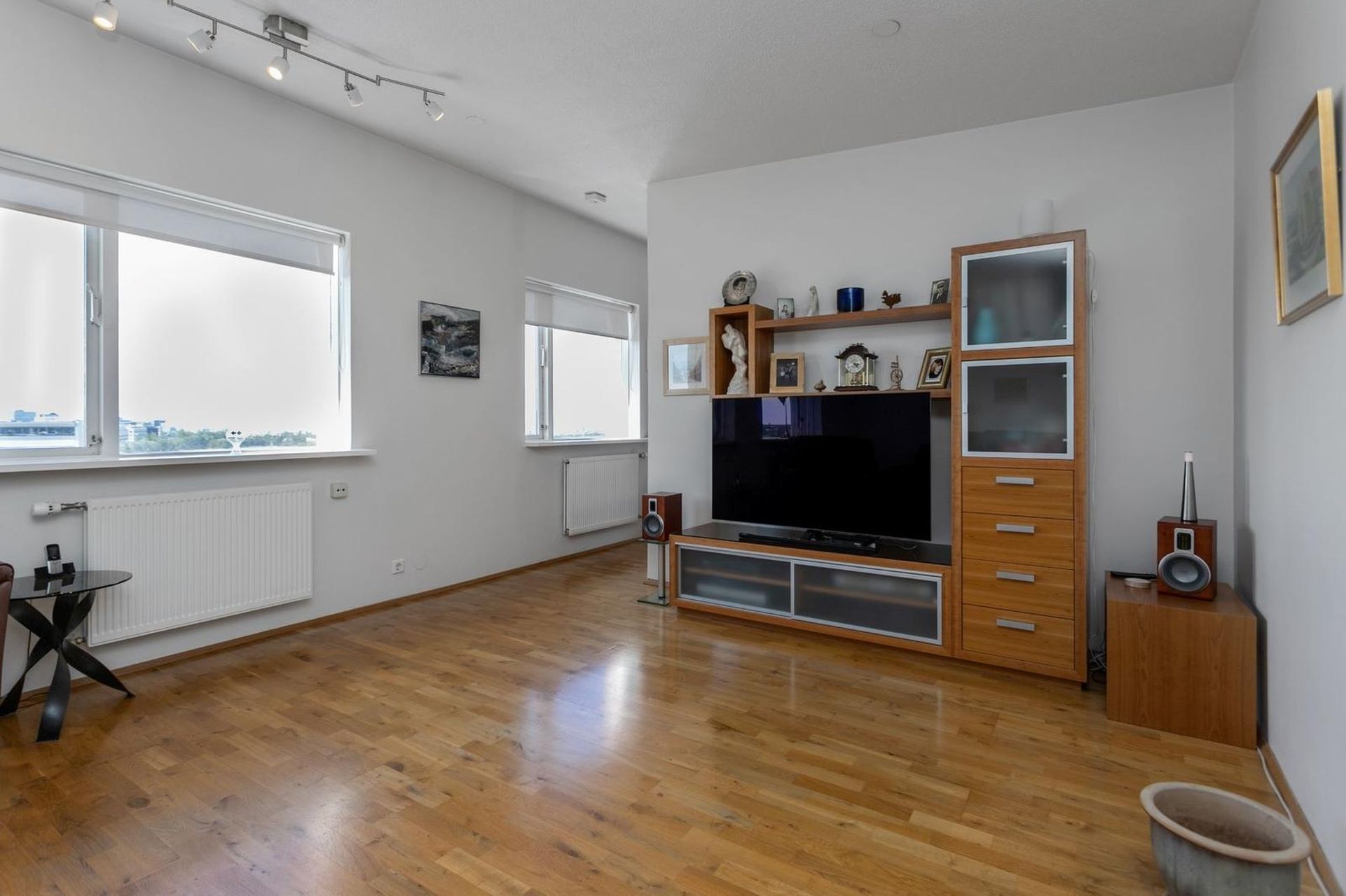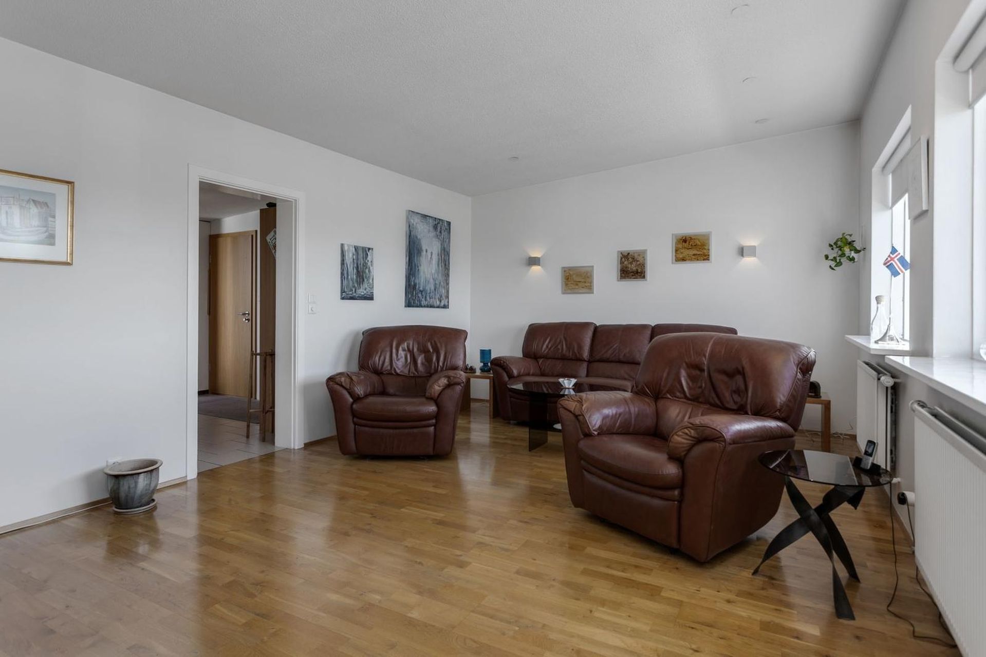 Stofa og borðstofa rúmgóð og björt með parketi á gólfi og glæsilegu útsýni.