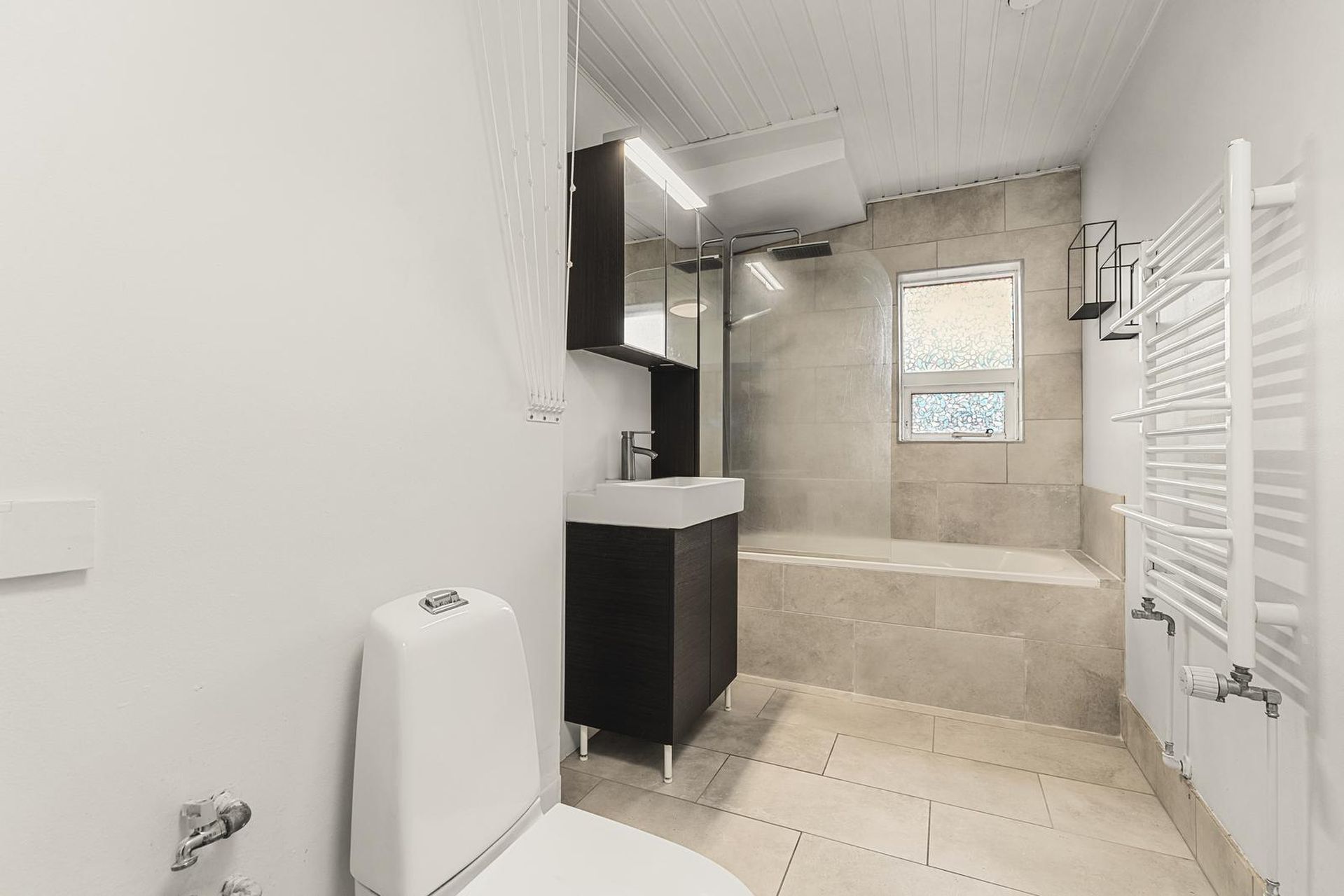 Baðherbergi með glugga, flísalagt á gólfi og veggjum, baðkar og innrétting við vask.