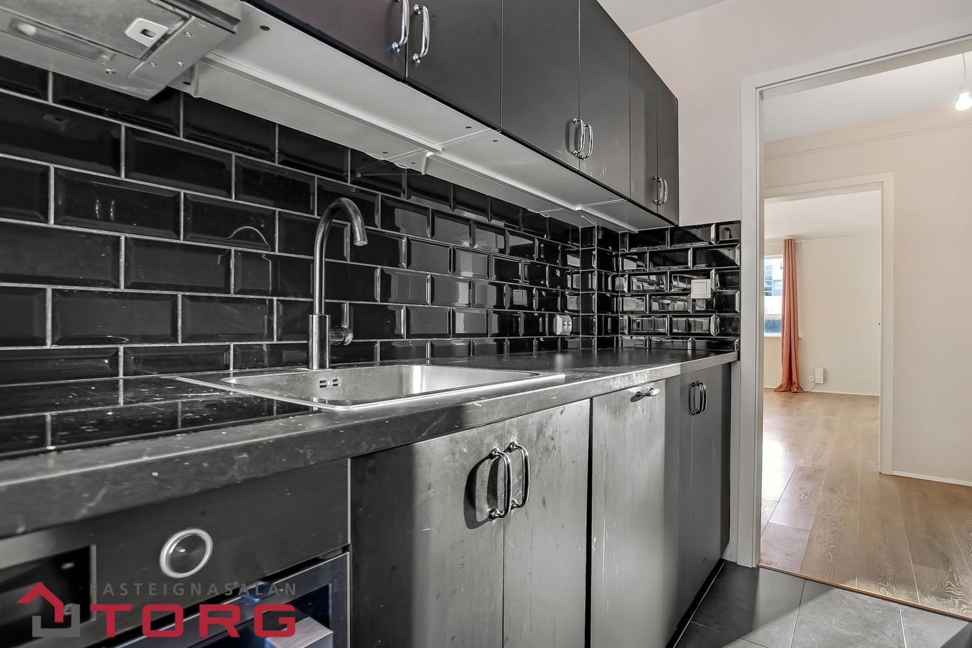 Eldhús. Dökk eldhúsinnrétting með góðu hirlsuplássi. Bakaraofn, helluborð, loftgleypir. Ísskápur og uppþvottavél innréttuð.