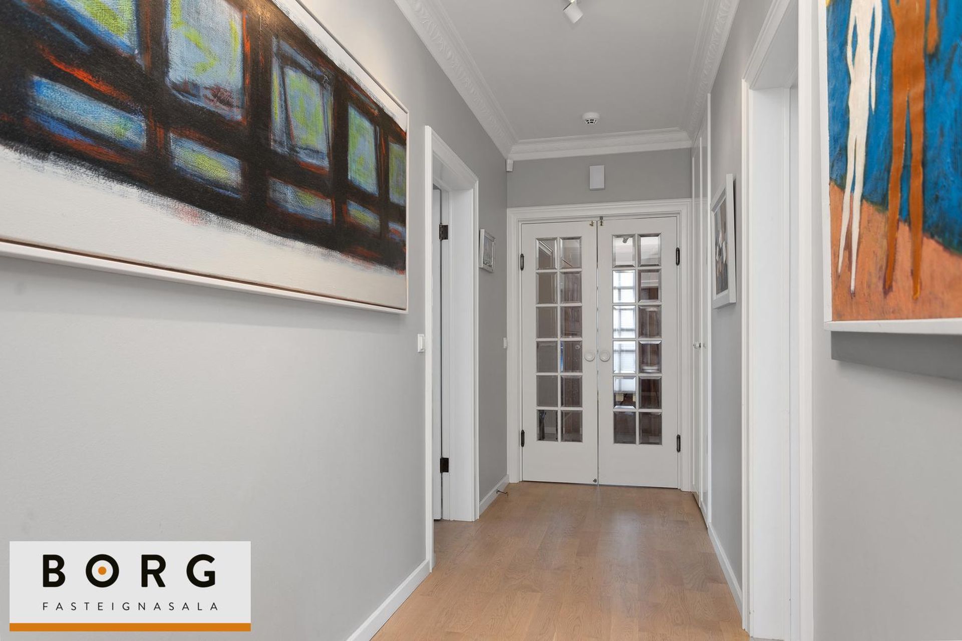 Gangur: Falleg tvöföld glerhurð skilur að anddyri og gang.