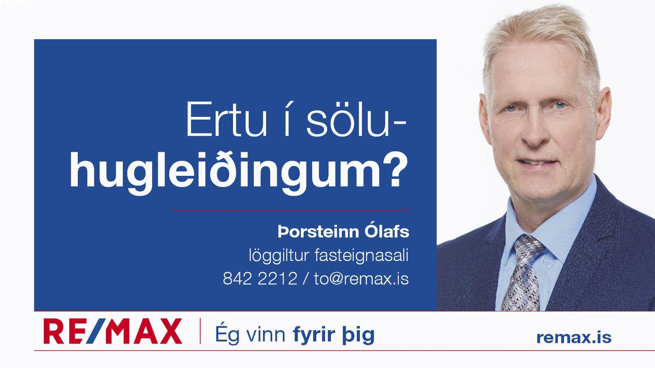 Vegna mikillar eftirspurnar vantar okkur allar tegundir eigna á skrá. Vinsamlega hafið samband við Þorstein Ólafs löggiltan fasteignasala í síma 842-2212 eða með pósti á to@remax.is.