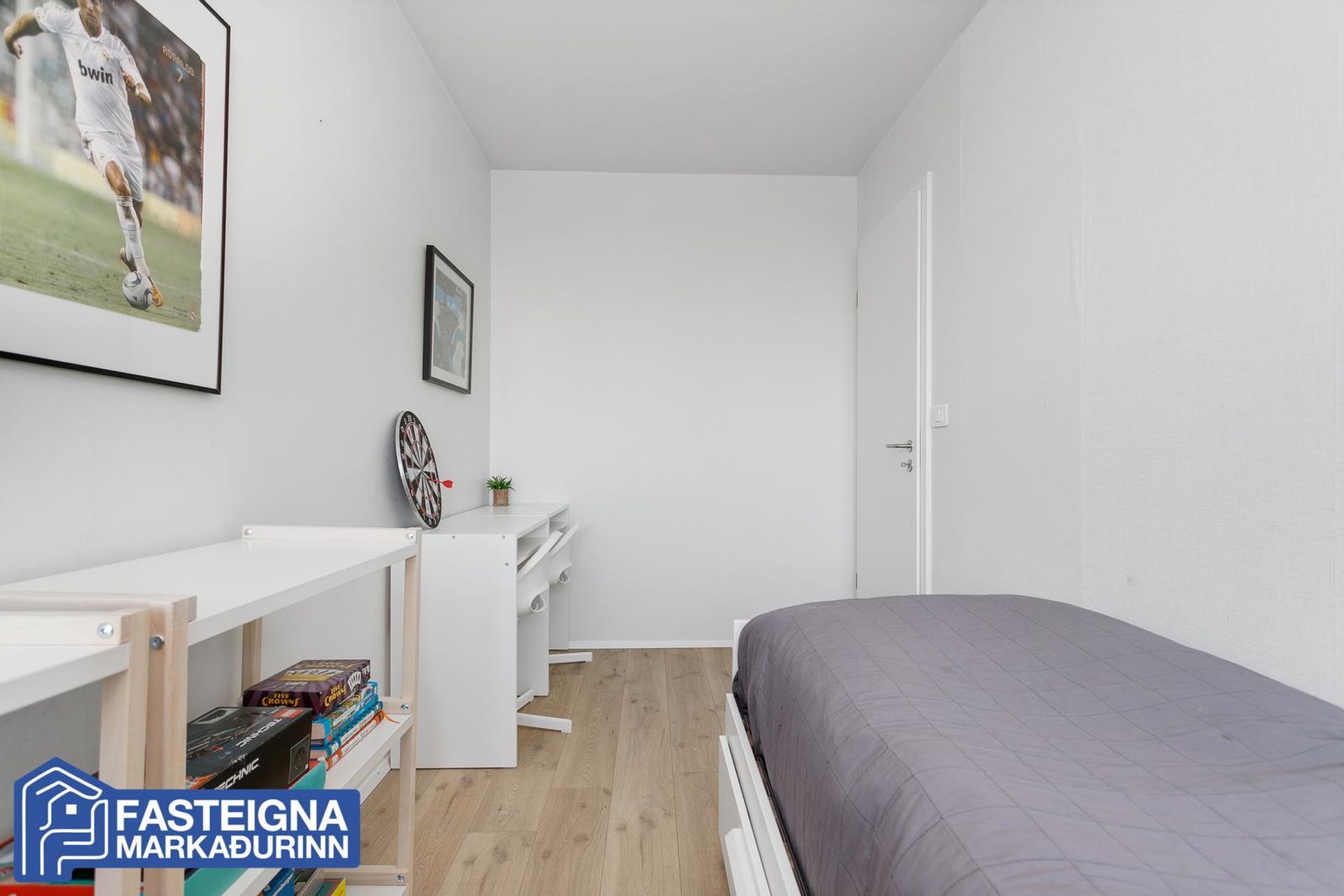 Hjónaherbergi, vinylparketlagt og rúmgott með innbyggðum fataskápum með rennihurðum.