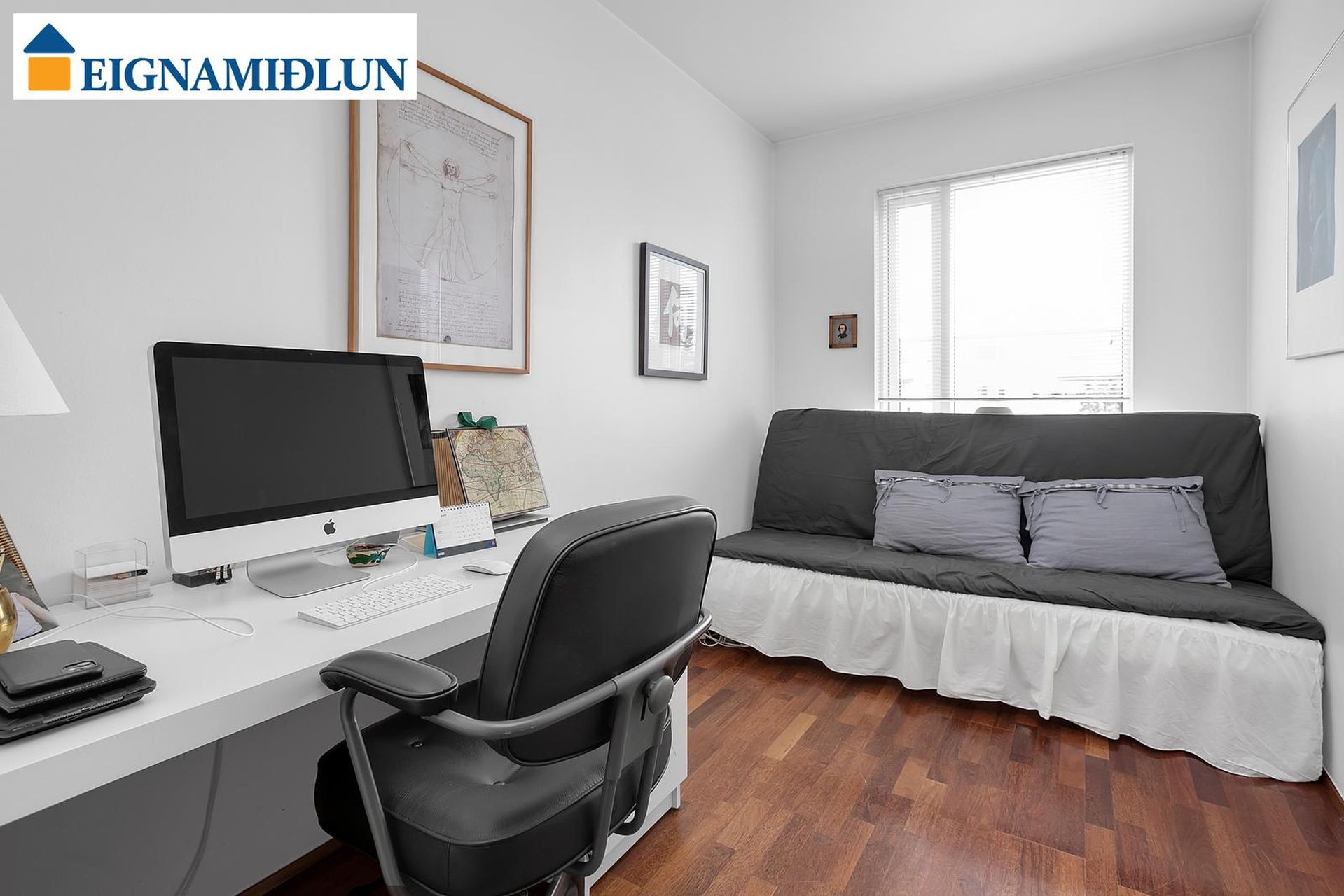 Nánari lýsing: komið er inn í parketlagt hol með skápum. Innaf holi er parketlagt herbergi. Stofurnar eru tvær samliggjandi, mjög rúmgóðar og bjartar með stórum gluggum. Gólf er parketlagt. Stórar svalir til vesturs eru útaf stofum. Útbúa mætti rúmgott herbergi með því að nýta hluta af stofurými. Eldhúsið er parketlagt og með fallegri innréttingu sem var endurnýjað fyrir um 20 árum síðan. Borðkrókur er í eldhúsi. Ný uppþvottavél er í eldhúsi. Innaf holi er komið í svefnálmu. Innaf svefnálmu eru hjónaherbergi og baðherbergi (tvö herbergi samkvæmt teikningu en hjónaherbergið hefur verið stækkað). Herbergin eru parketlögð. Góðir skápar eru í svefnálmu og einnig í hjónaherbergi. Svalir til suðurs eru útaf hjónaherbergi. Nýleg svalahurð. Baðherbergið var standsett fyrir um þremur árum síðan. Sturta er á baðherbergi. Gólf er flísalagt. Gluggi er á baðherbergi.