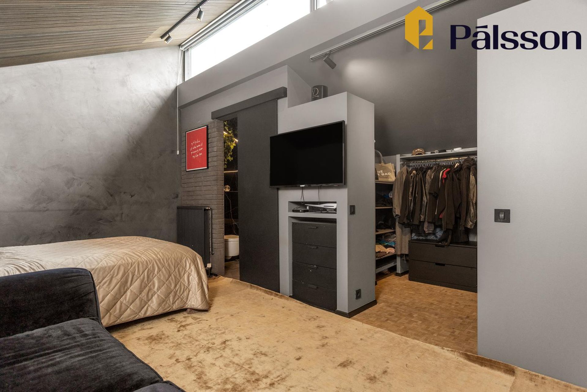 Svefnherbergi er með aukinni lofthæð með millilofti, fataherbergi og gegnheilt endaparket á gólfi.