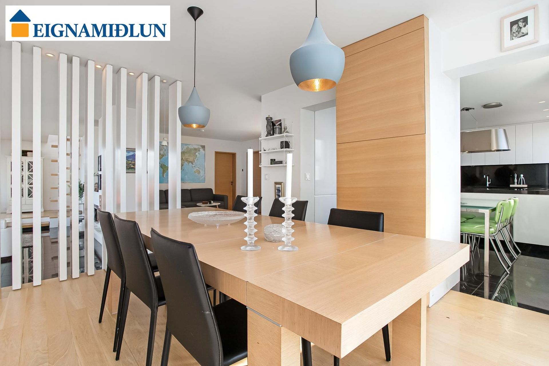 Glæsilegt 331 fm. einbýlishús á tveimur hæðum innst í botnlanga. Stórkostlegt útsýni er frá þaksvölum og koníakstofu á þaki. Möguleiki er á aukaíbúð með sérinngangi á neðri hæðinni. Húsið er teiknað af Kjartani Sveinssyni.