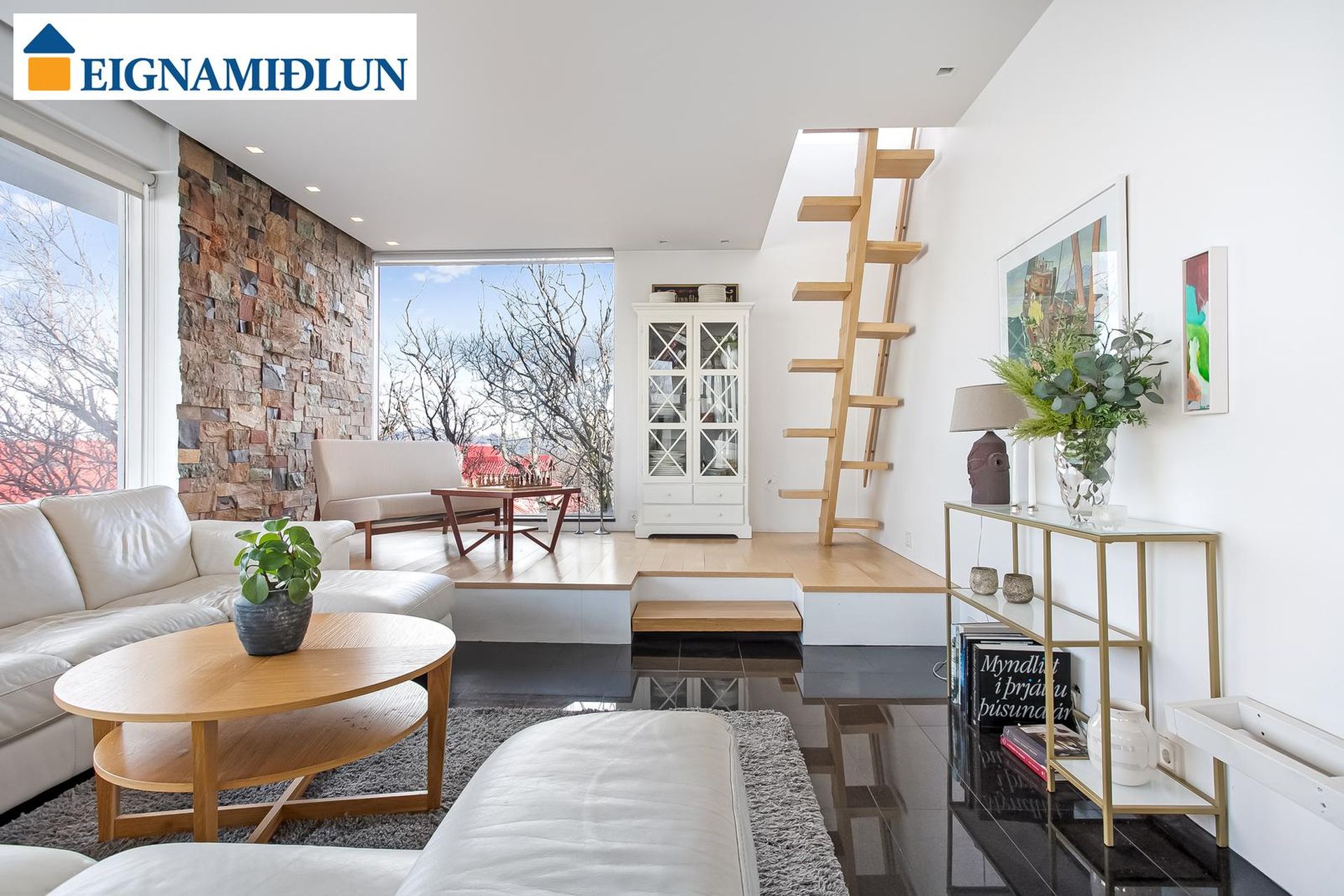 Björt stofa með flísum og parketi á gólfi, stórum gluggum og lýsingu í lofti. Út frá stofu eru rúmgóðar vestursvalir. Úr stofunni er opinn stigi upp í koníakstofu með parketi. Þar eru gluggar með stórbotnu útsýni til allra átta.