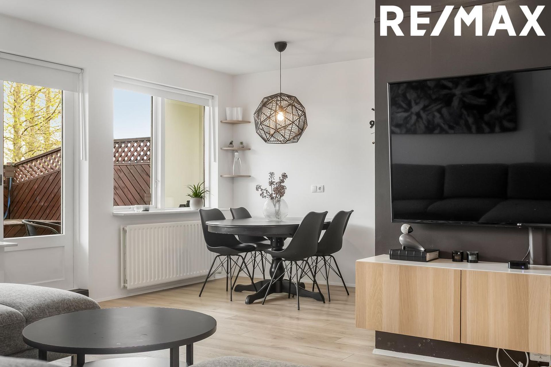 Stofa/borðstofa er björt og opin með harpðparketi á gólfi með útgengi út á rúmgóða sólpall.