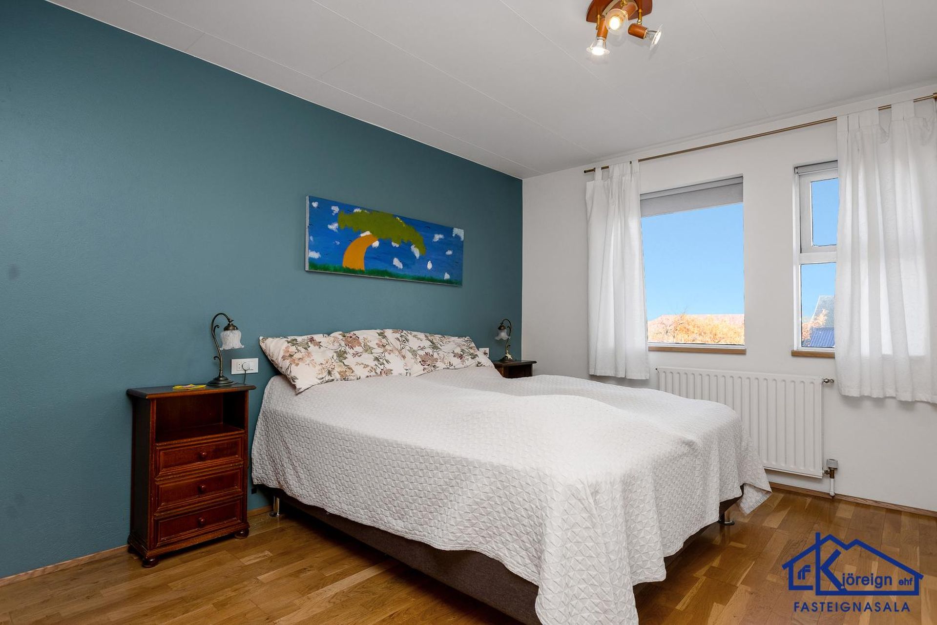 Svefnherbergi I: rúmgott með fataskápum, parket á gólfi.