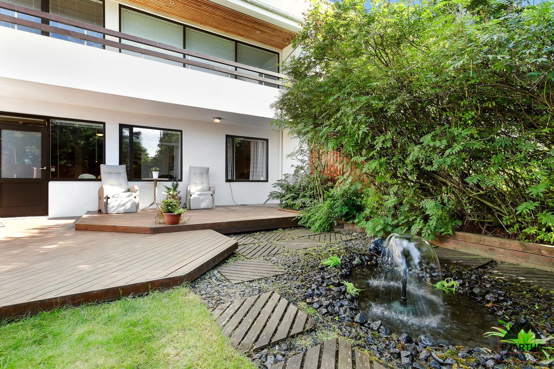 Úr snjónvarpsholi er útgengi á viðarpall og fallegan garð. Flísar á gólfi með gólfhita.