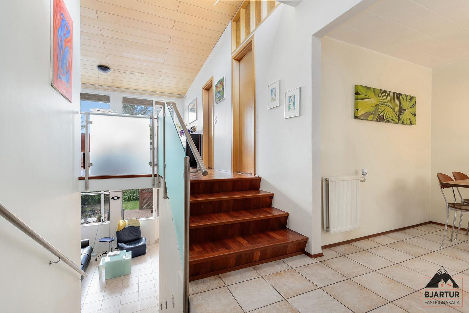 Úr holi er einnig gengið upp á efri og neðri palla hússins. Þrjú parketlögð þrep eru upp á efri pallinn og teppalagður stigi liggur niður á neðsta pallinn. Stigahandriðin eru úr burstuðu stáli og sandblánu öryggisgleri. Eldhús með ljósri innréttingu, flísum á milli skápa og góðum borðkrók.