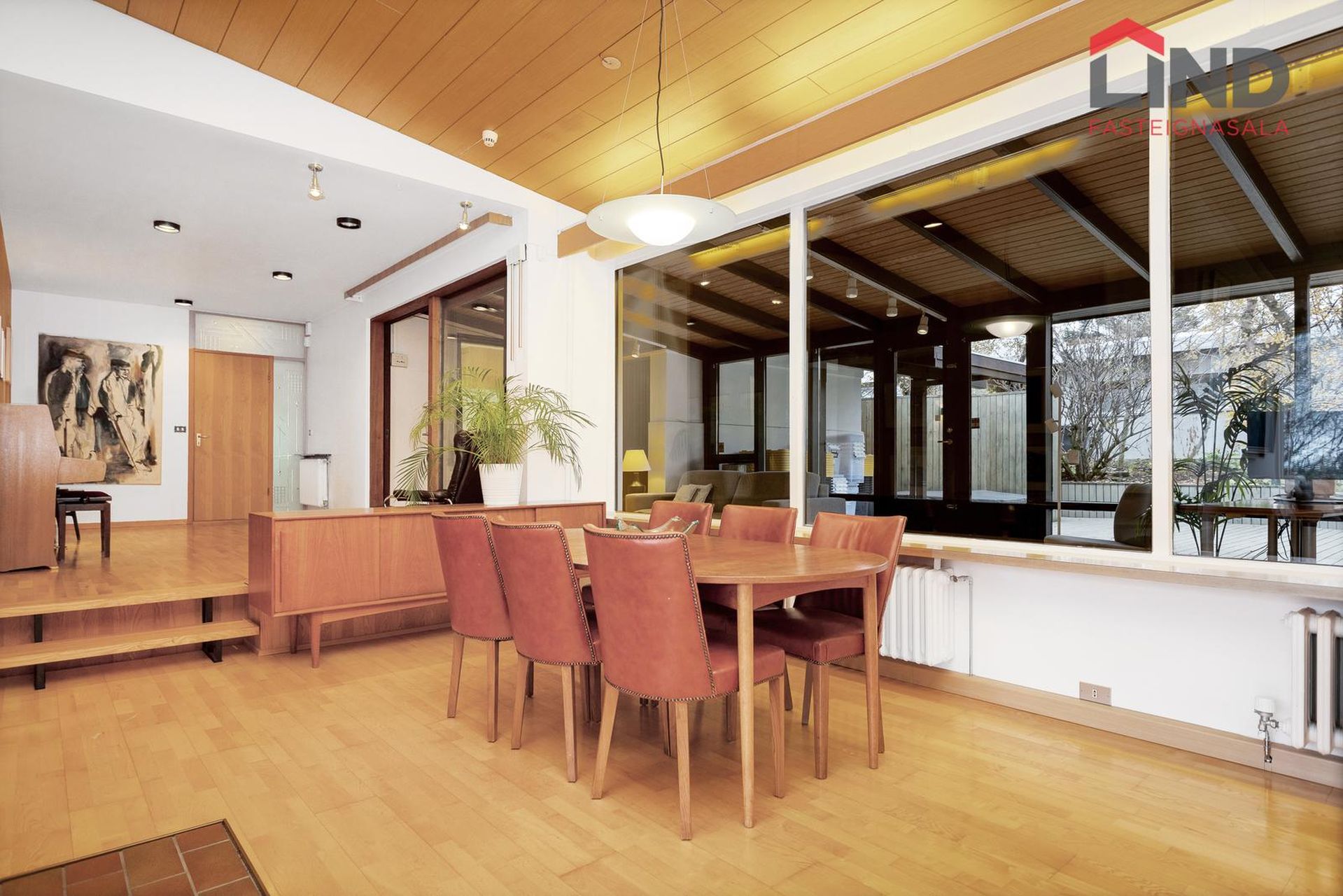 Stofa og borðstofa eru samliggjandi í opnu, björtu rými með mikilli lofthæð. Parket á gólfi, arinn. Stórir gluggar beggja vegna setja svip sinn á rýmið.