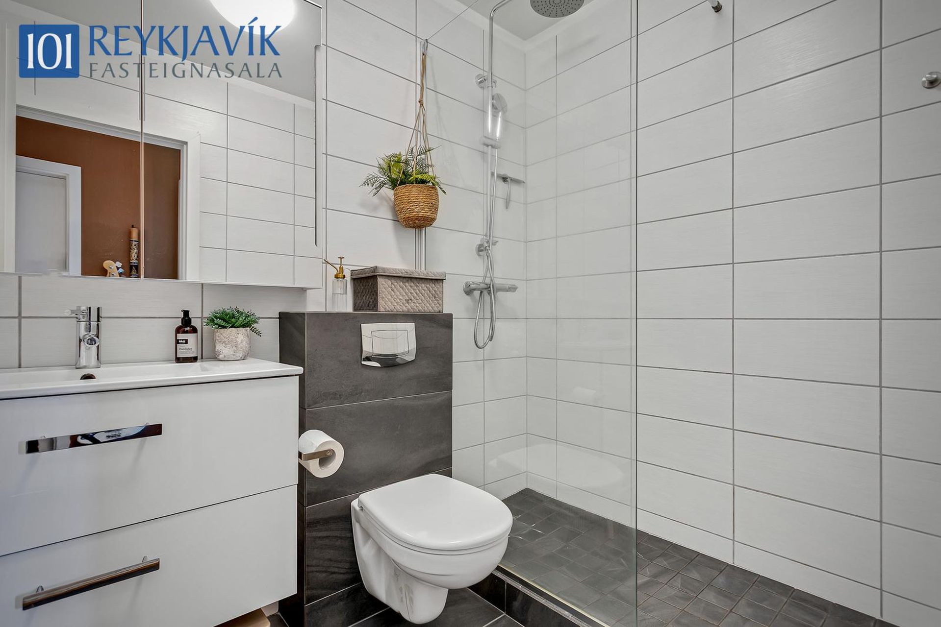 Baðherbergi - Uppgert 2015, flísalagt, upphengt salerni og sturta með sturtugleri. Baðinnrétting hvít með handlaug og skúffum og baðskápur fyrir ofan. 2025 sturtuhausar og festingar endurnýjaðar.