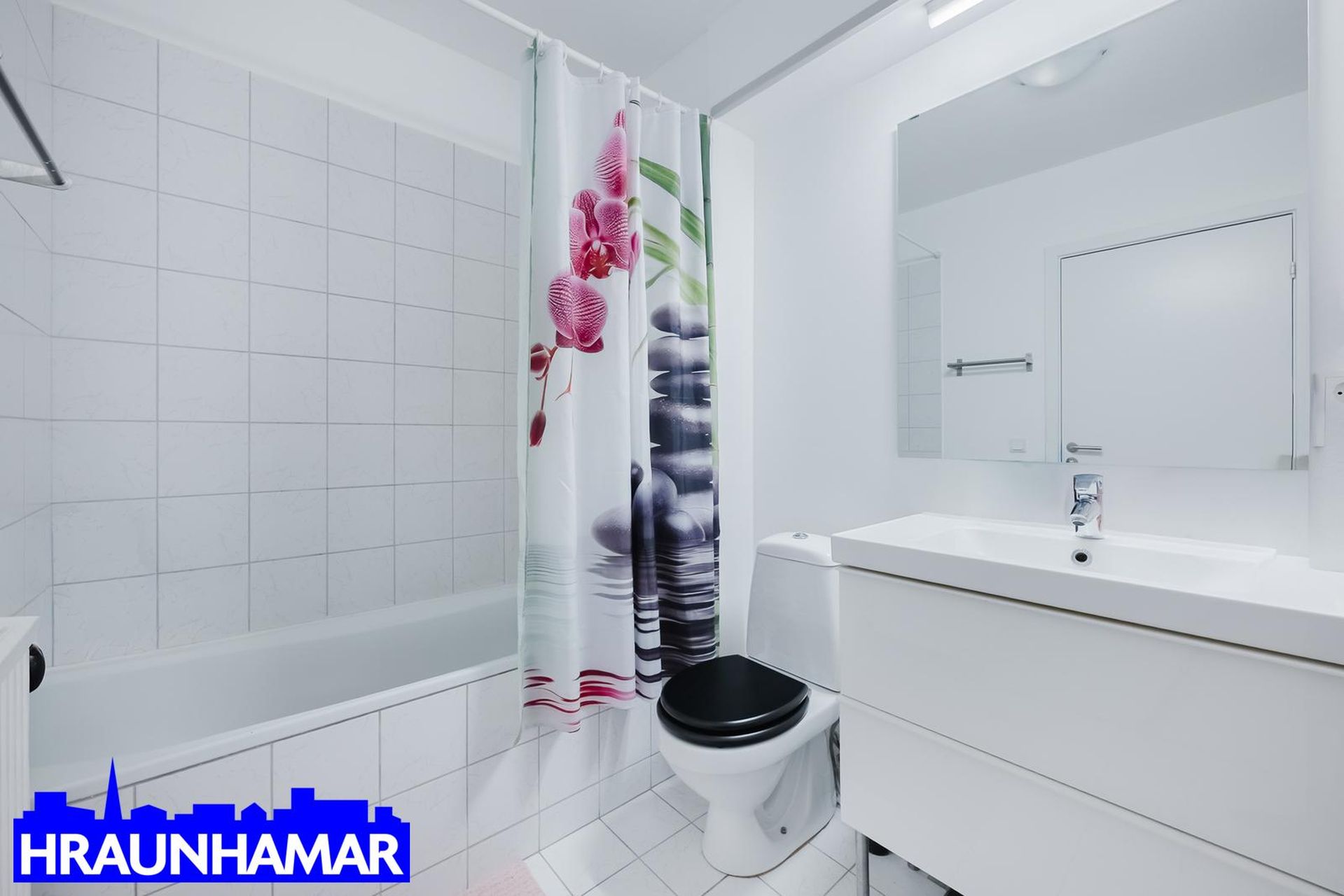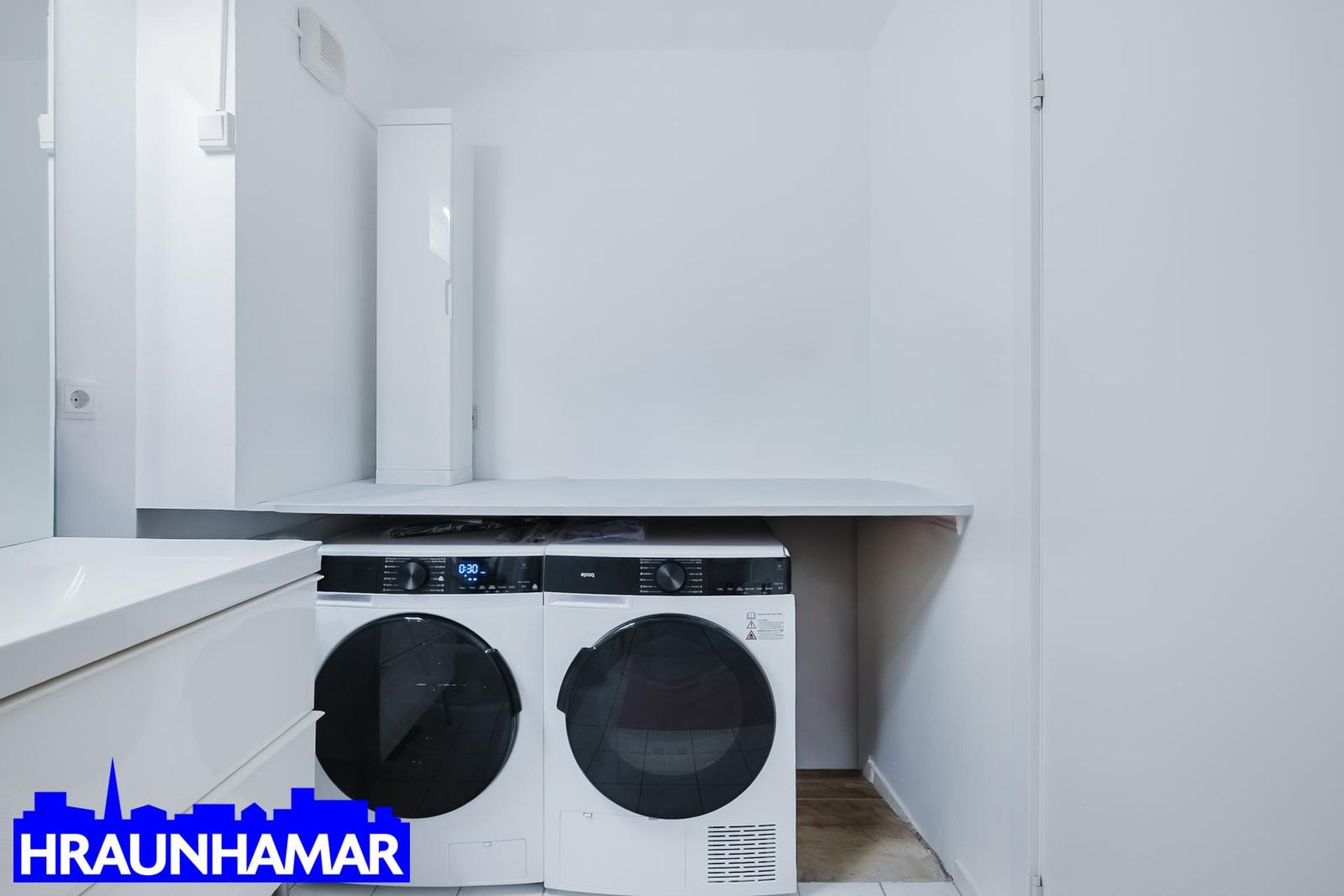 Flísalagt baðherbergi, hvít innrétting, baðkar með sturtuaðstöðu í, salerni, tengi fyrir þvottavél og þurrkara.