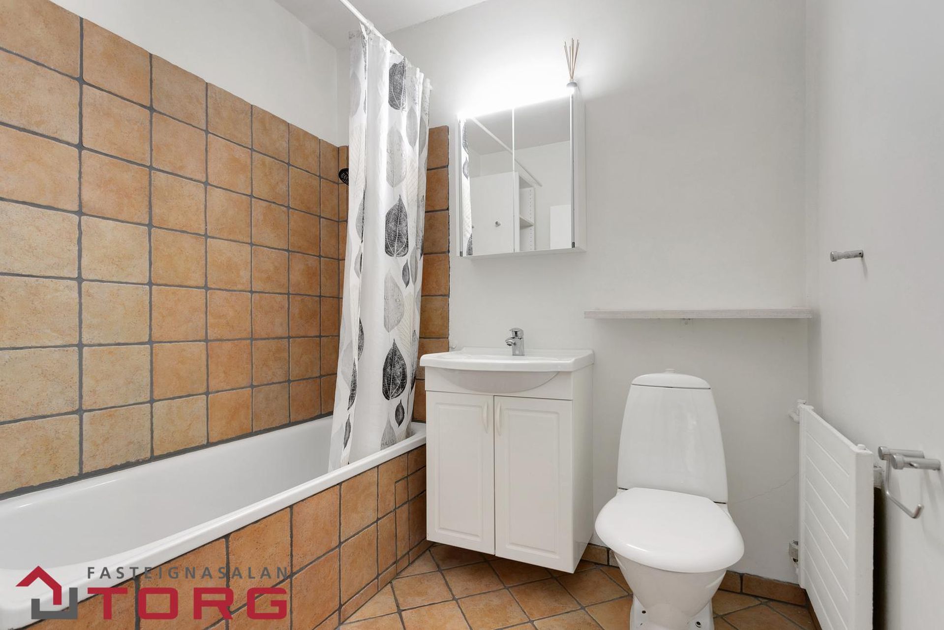 Baðherbergi er með baðkari og sturtu, flísalagt á gólfi og sturtuvegg.