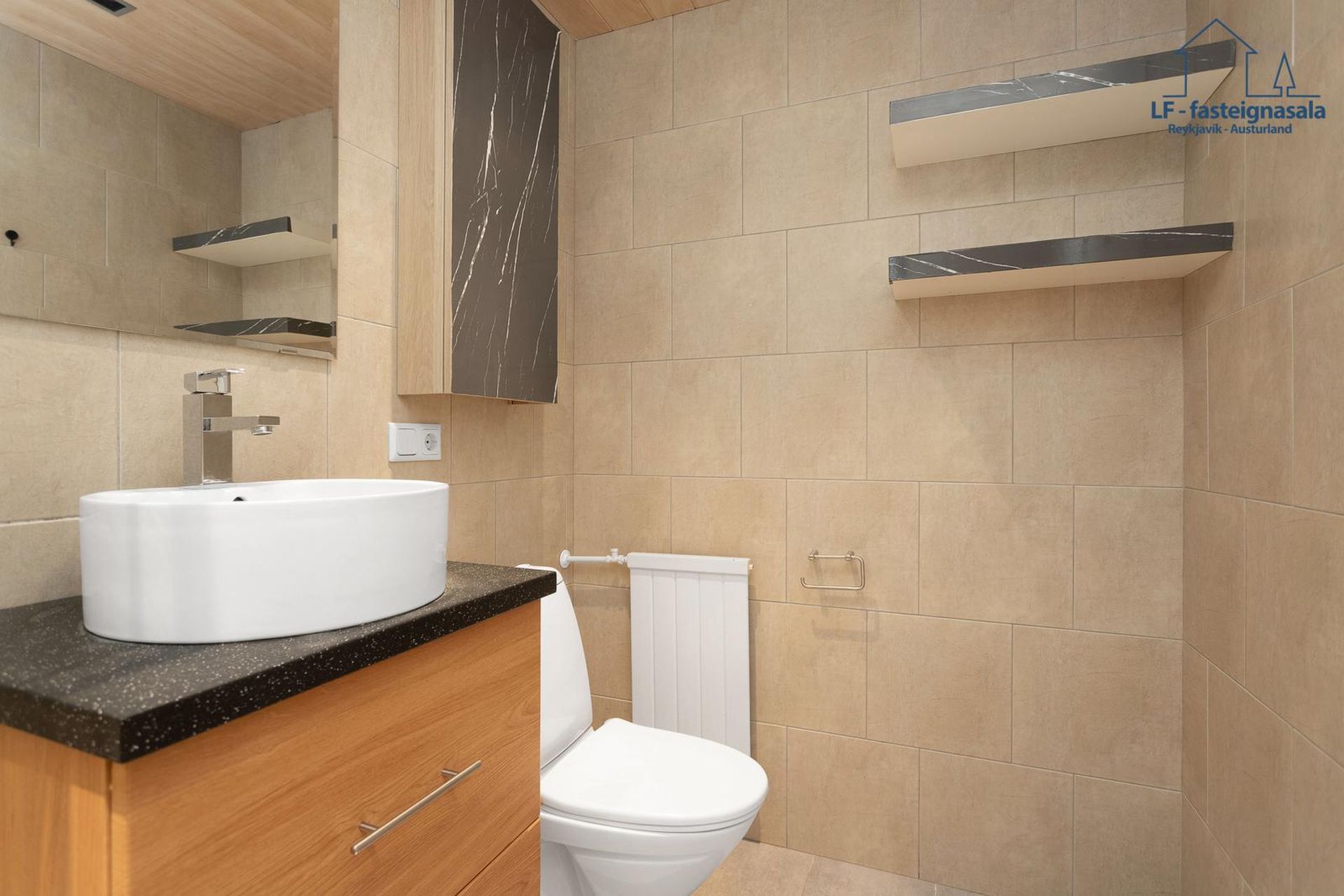 Baðherbergi lítur vel út. Flísalagt í hólf og gólf. Nýr sturtuklefi og blöndunartæki. Tengi fyrir þvottavél.