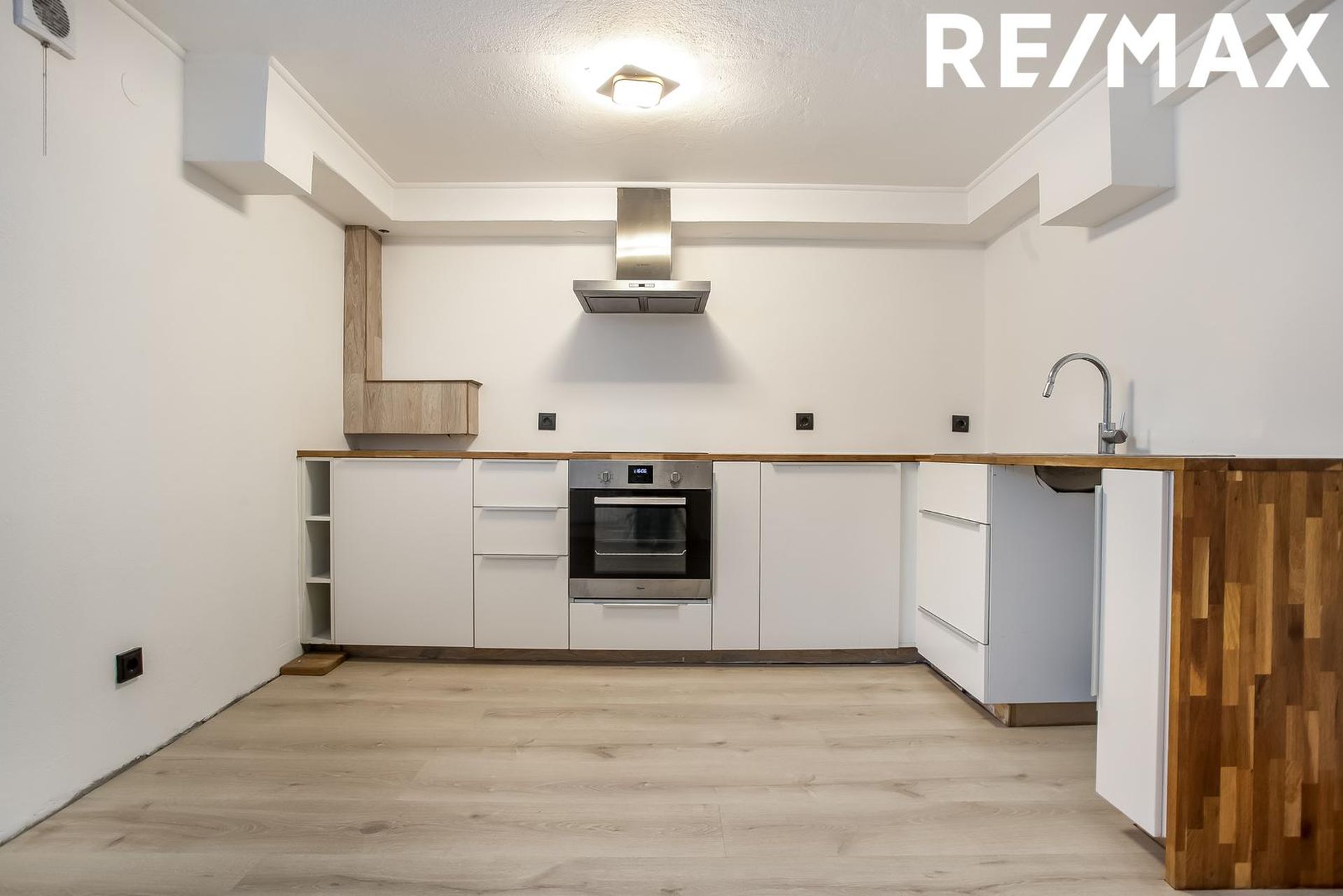 Eldhús er með hvítri fallegri innréttingu og viðarborðplötu. Tengi fyrir uppþvottavél og ísskáp. Rúmgott rými þar sem rúmast vel fyrir eldhúsborði. Harðparket á gófli.