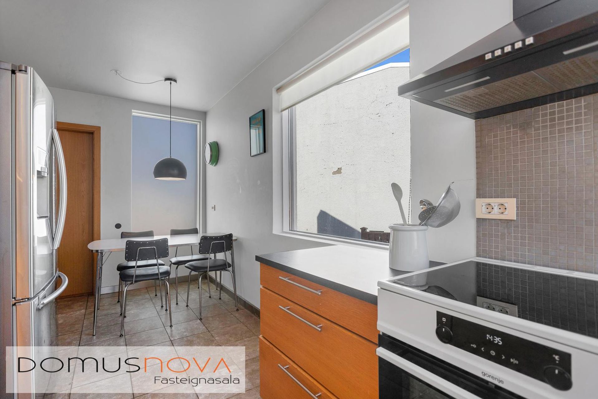 Eldhús: Bjart og rúmgott með sérsmíðaðri innréttingu, frístandandi tvöfaldur ísskápur ásamt frístandi eldavél með háf yfir. Fínn borðkrókur, gluggar á þrjá vegu. Flísar á gólfi.
