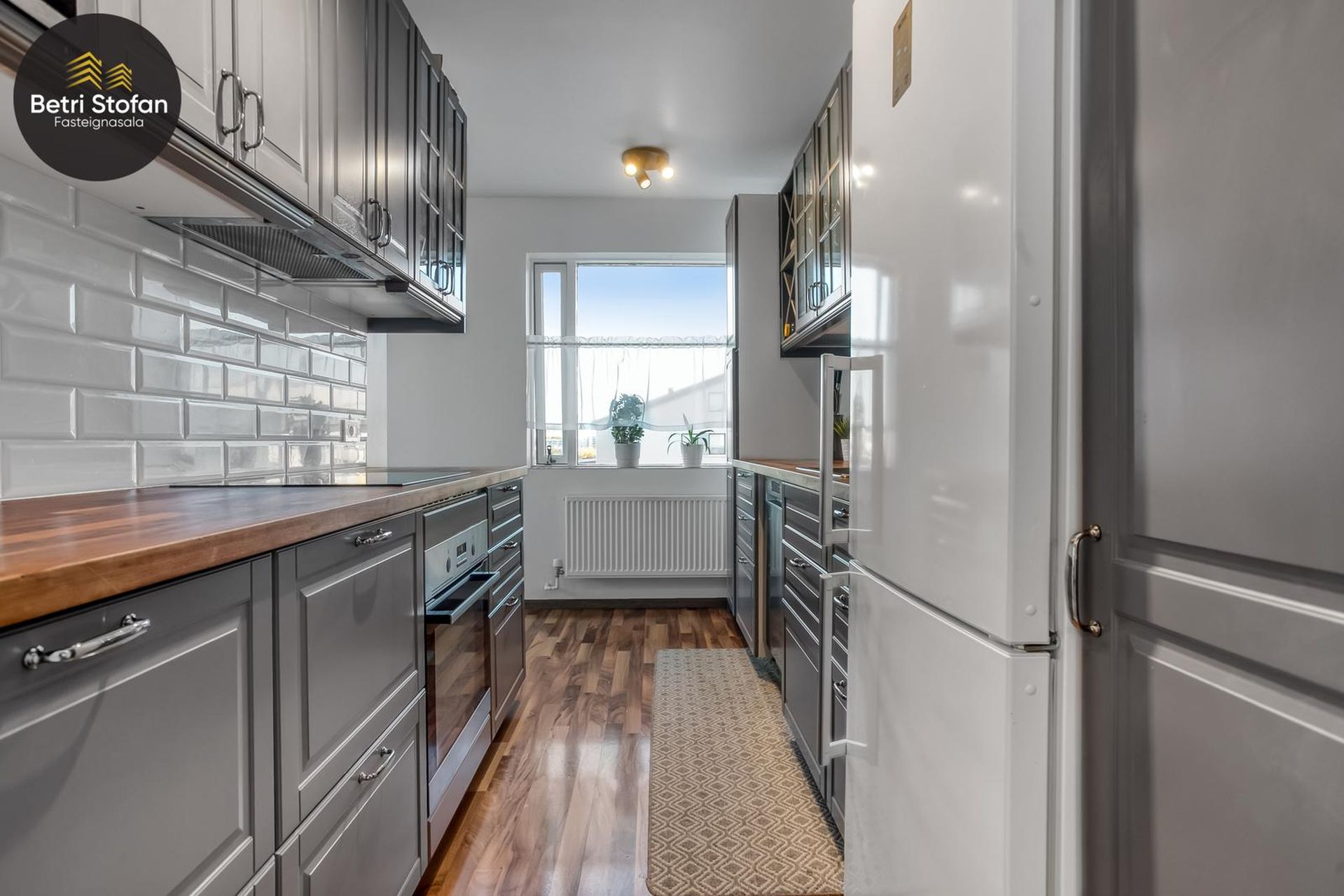 Eldhús: Falleg innrétting með fínum tækjum, parket á gólfi.