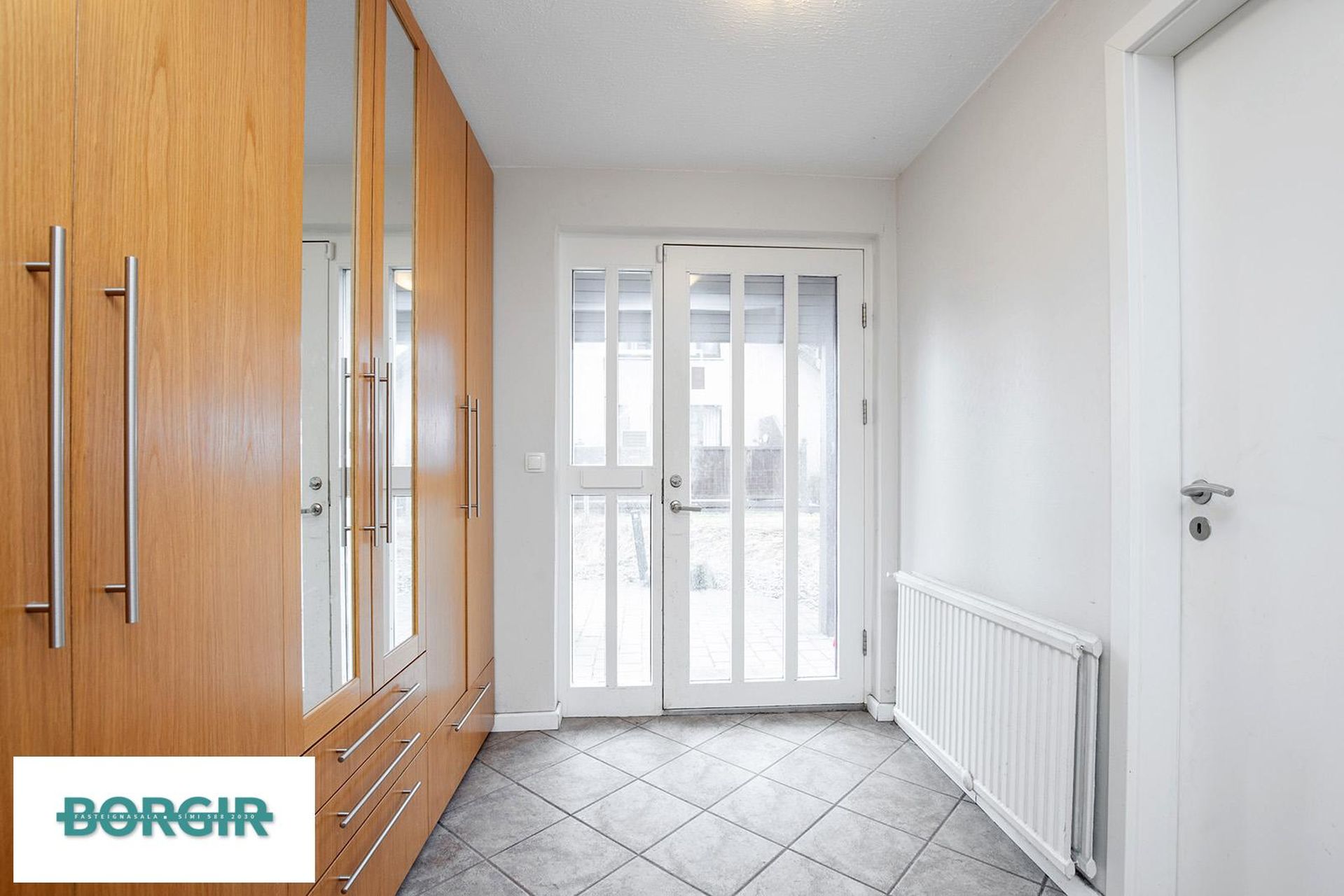 Anddyri: Flísalagt með góðum fataskáp.