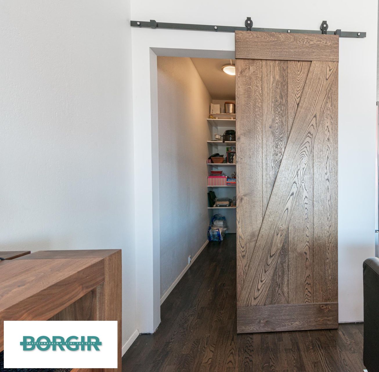 Rúmgott búr með hillum er við hlið eldhússins en þar er skemmtilega hönnuð old style barn rennihurð