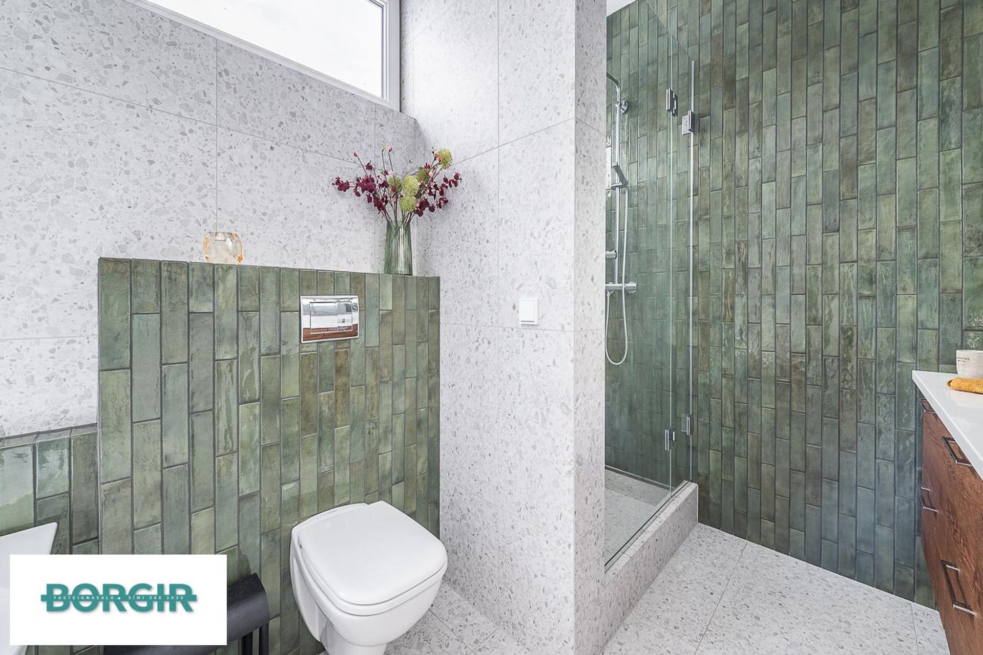 Baðherbergi og þvottahús er í sameiginlegu rými, endurnýjað 2023 með nýjum flísum í hólf og gólf, stór sturtuklefi með glerhurð, upphengt salerni og ný rúmgóð baðinnrétting, Innrétting fyrir þvottavél og þurrkara í vinnuhæð.