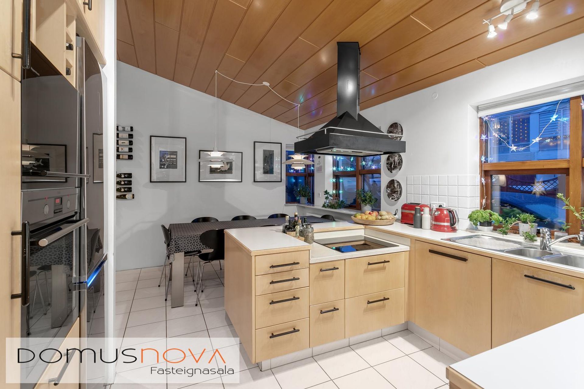 Eldhús: flísar lagðar meðfram eldhúsinnréttingu, eitt rými með stofu. Falleg eldhúsinnrétting og öll tæki, Siemens uppþvottavél, innbygður örbylgjuofn.