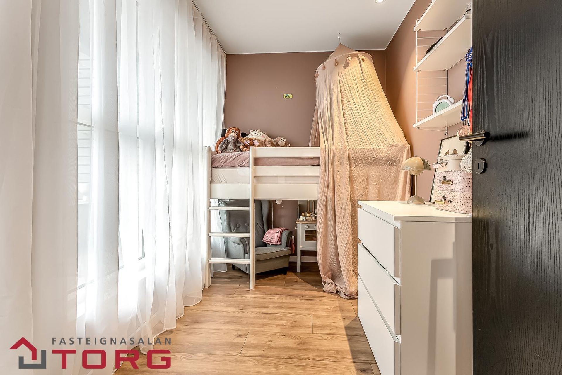 Barnaherbergi (3) með gólfsíðum glugga, fataskáp og parket á gólfi.