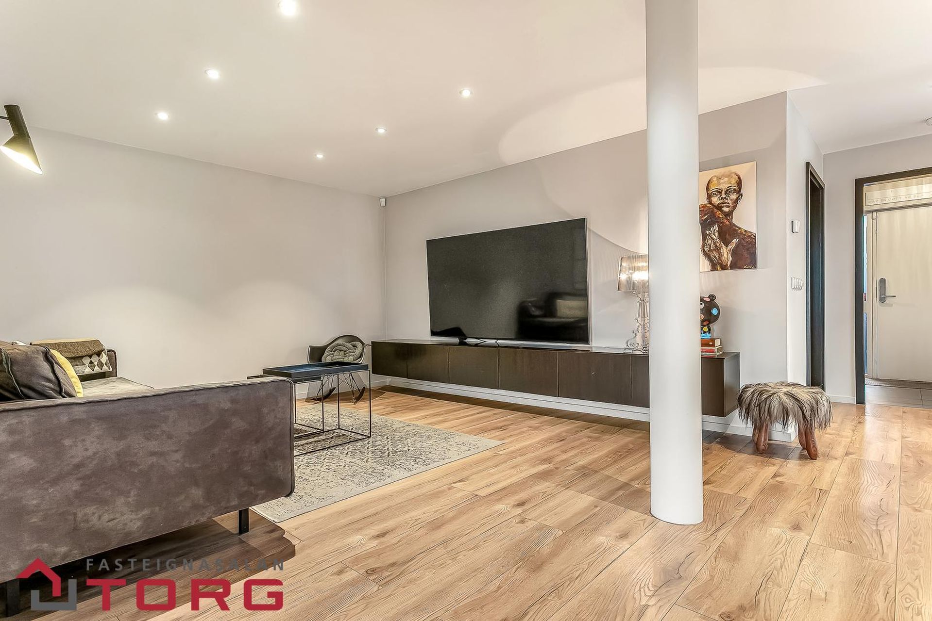 Stofa er rúmgóð og rúmar vel stóran sófa og stórt sjónvarp, staðsett í miðri íbúðinni.