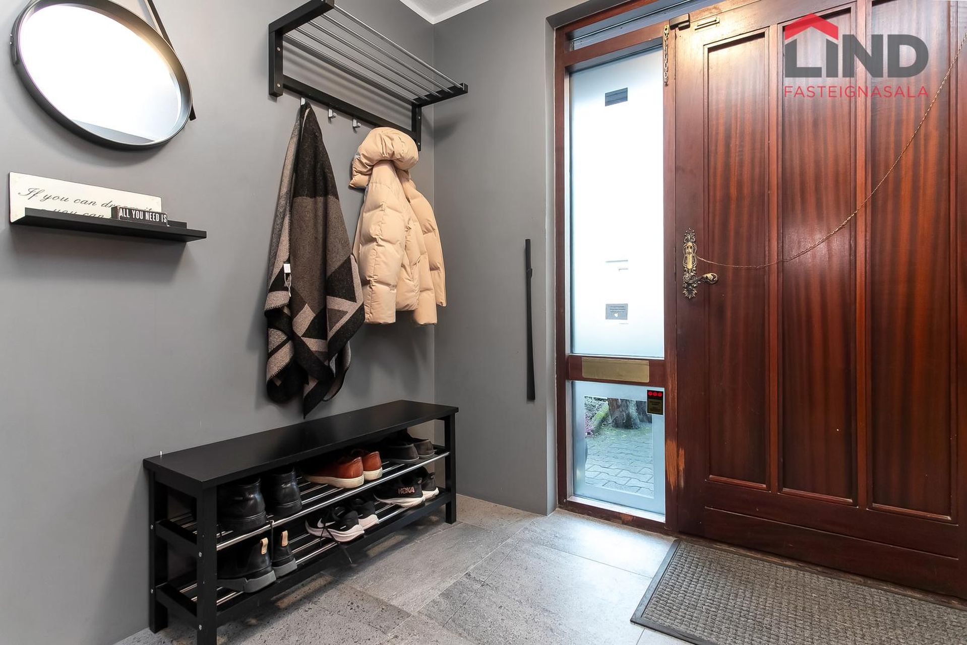 Forstofa með flísum gólfi og þaðan er gengið inn í hol/stofu. Hiti er í stéttinni úti, fyrir framan forstofuna.