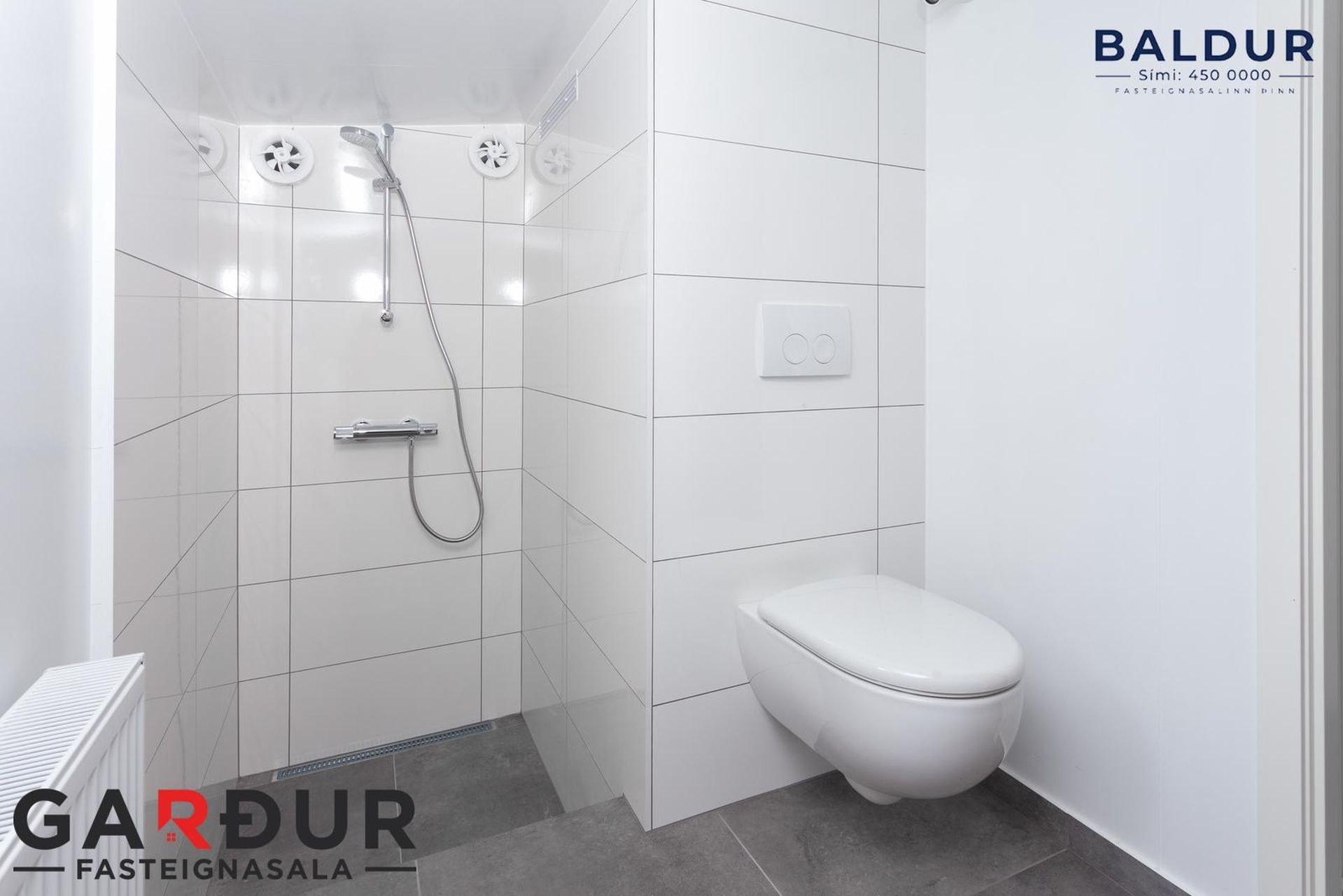 Baðherbergi: Flísar á gólfi og í sturtu. Ný innrétting með skúffum, Grohe blöndunartæki, vegghengt salerni frá Tengi, tengi fyrir þvottavél og þurrkara. Ný Samsung þvottavél fylgir. Sturtan flísalögð með flísum frá Álfaborg og veggir málaðir með háglans lakki.
