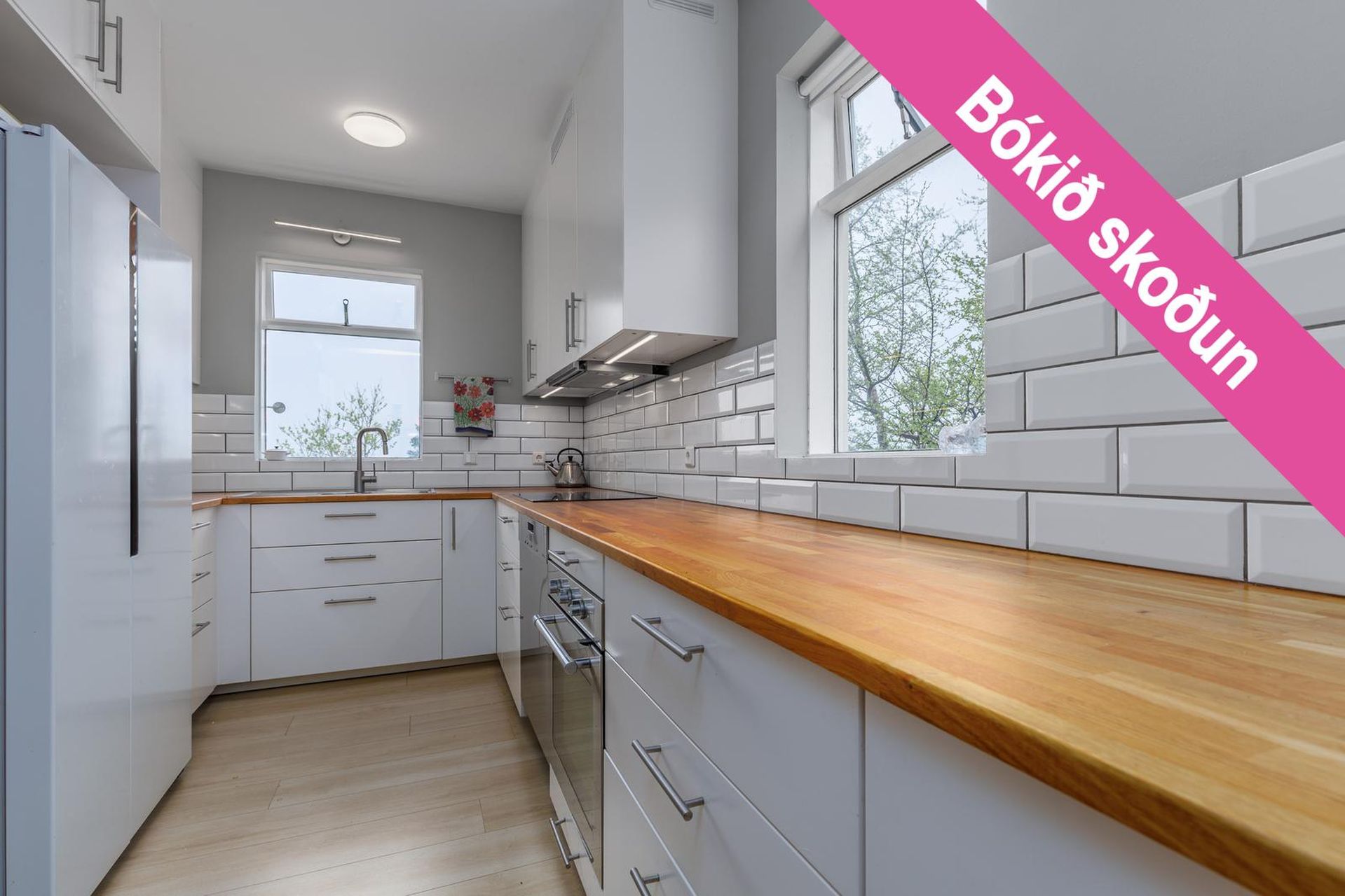 Bílskúr: Góður 26 fm upphitaður bílskúr með köldu neysluvatni. Fjarstýrður bílskúrshurðaopnari.