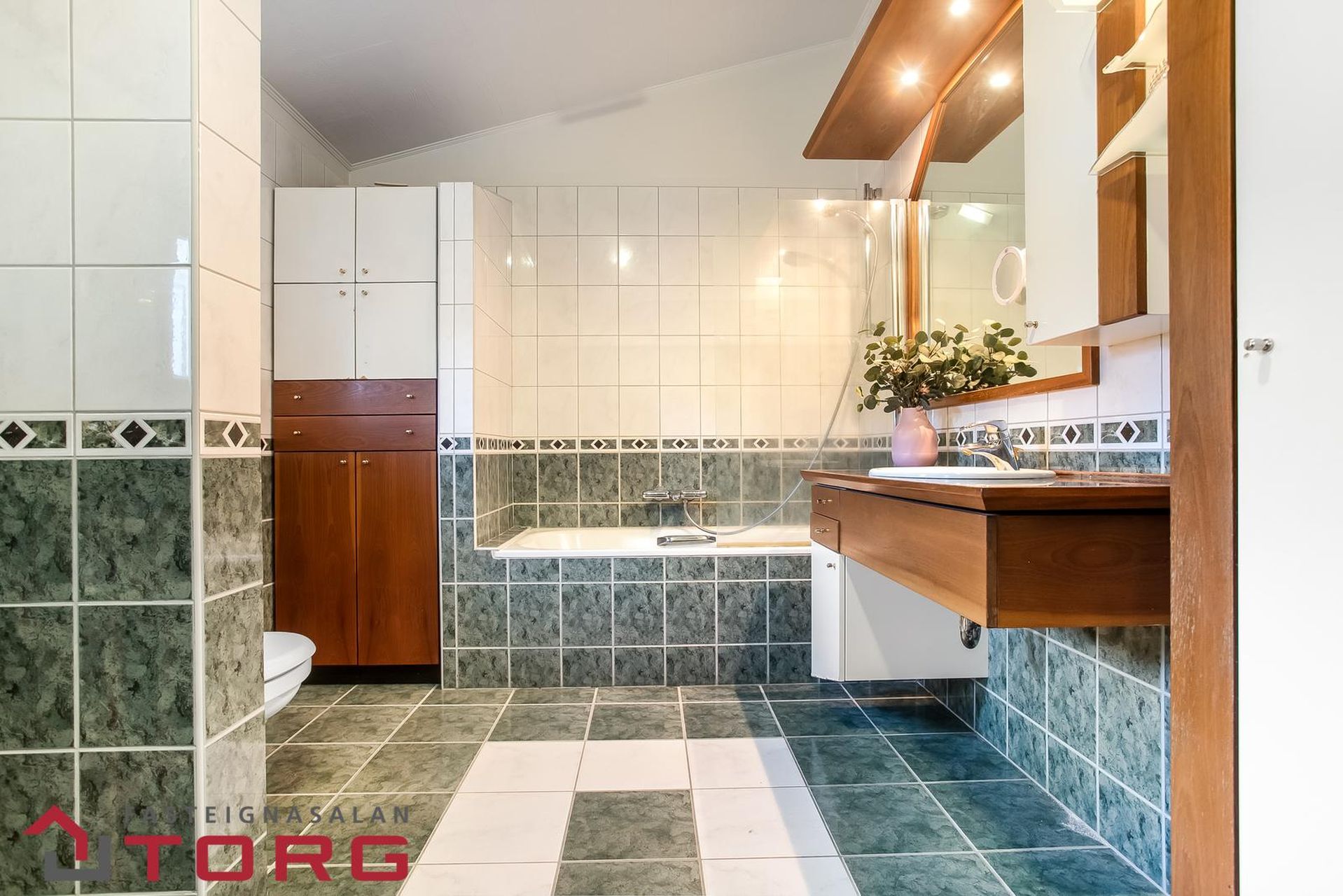 Baðherbergi (aðal) er með fallegum og vönduðum innréttingum, upphengdu salerni, baðkari með sturtu og nægu skápaplássi. Allt flísalagt hátt og lágt með vönduðum flísum.