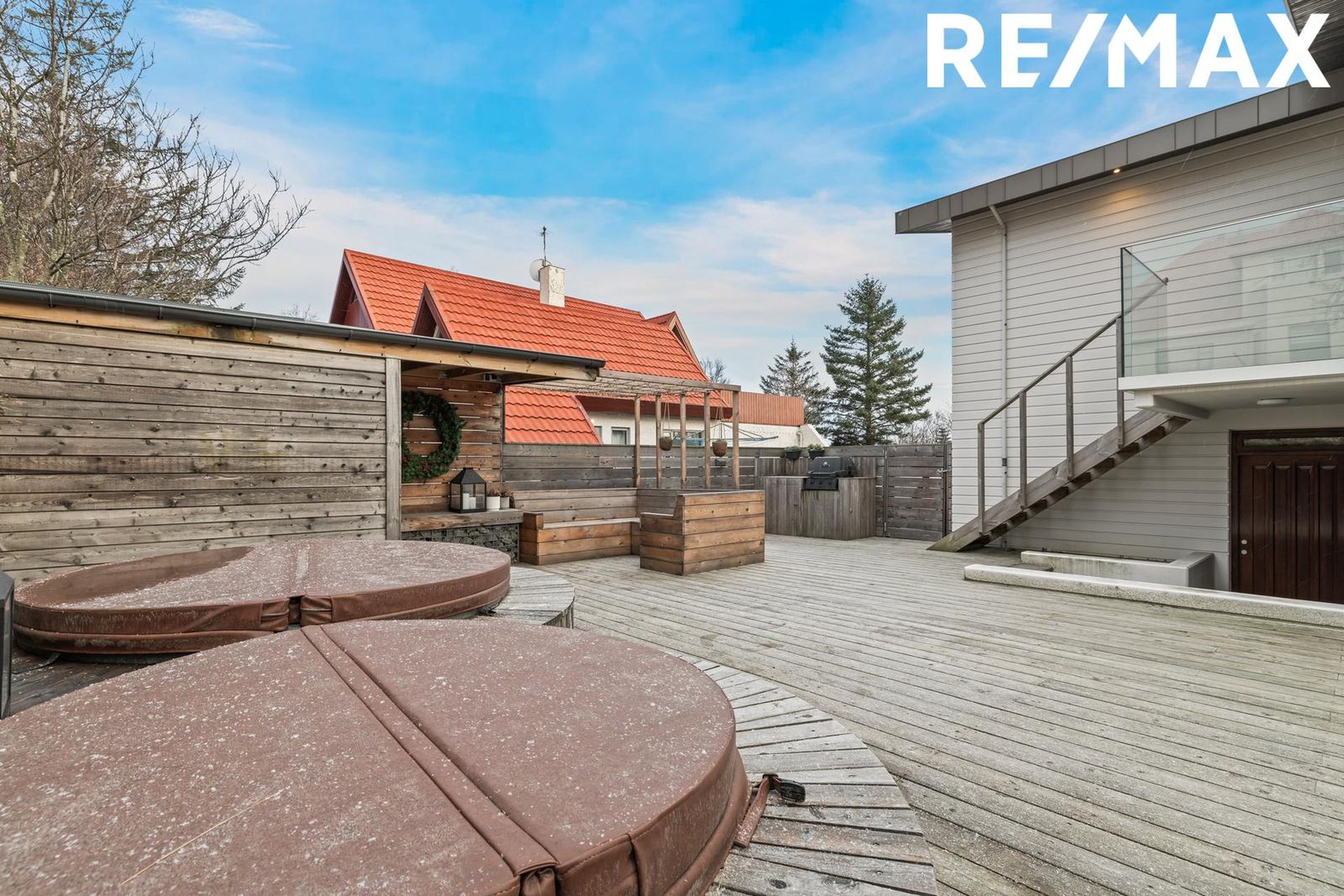 Verönd: Sannkallaður sælureitur, stór og mikill pallur með heitum og köldum potti, fallegri saunu með lýsingu undir bekkjum og reyktu gleri í rennihurð. Garðhýsi og setubekkir með ljósa "pergólu", hlaðnir grjótveggir og grillskápur.